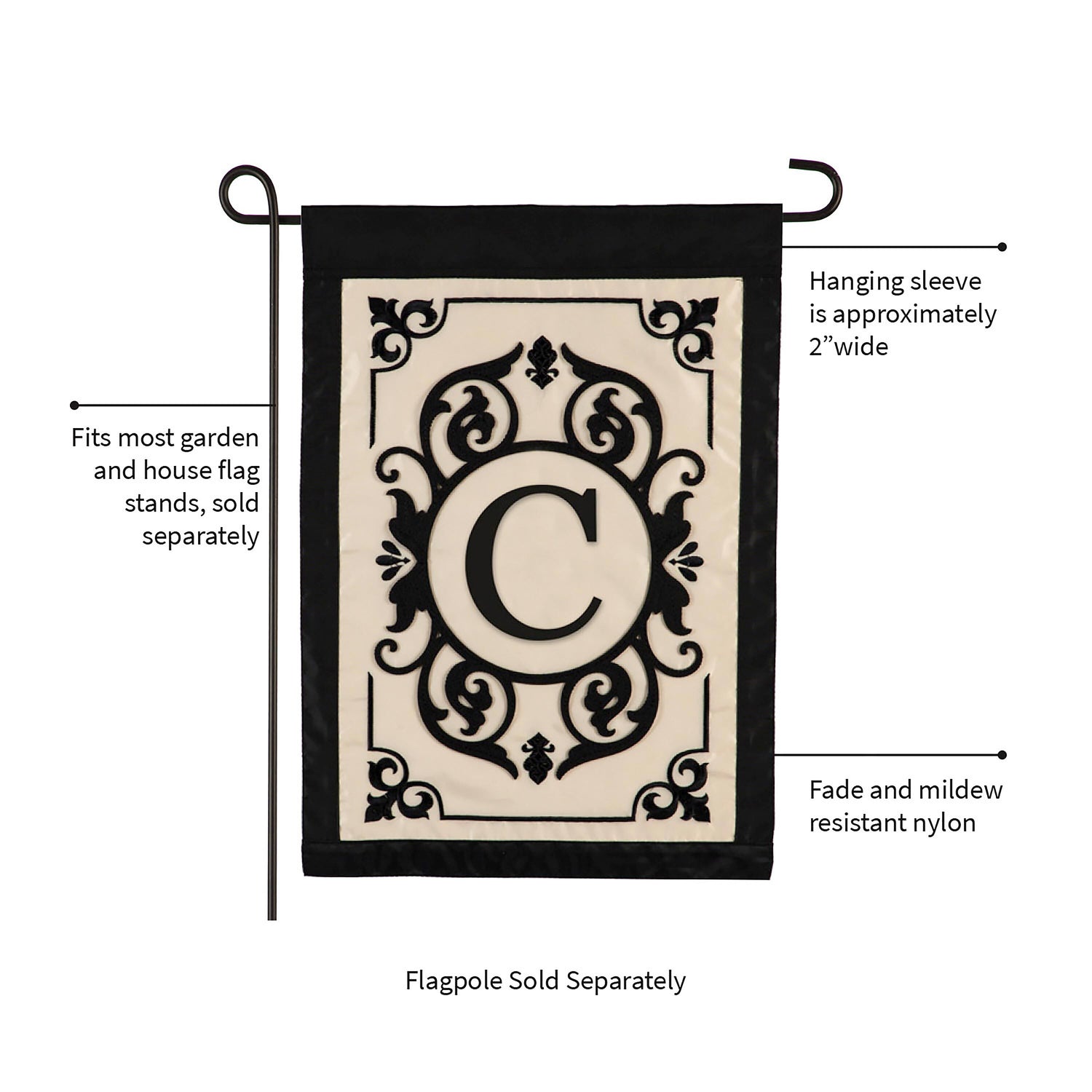 Greet guests in style with this Cambridge Monogram Appliqu?© Garden Flag, Letter C. Eye-catching embellishments and intricate details make the piece stand out. Our appliqué flags were first introduced more than 20 years ago, and thanks to their bold artwork and top-of-the-line materials they continue to be just as popular today. Each flag is made of strong 310 denier nylon to withstand all types of weather. We combine pieces of fade-resistant fabric with tight, detailed stitching to create a mosaic effect. The soft yet heavyweight material illuminates beautifully in sunlight.