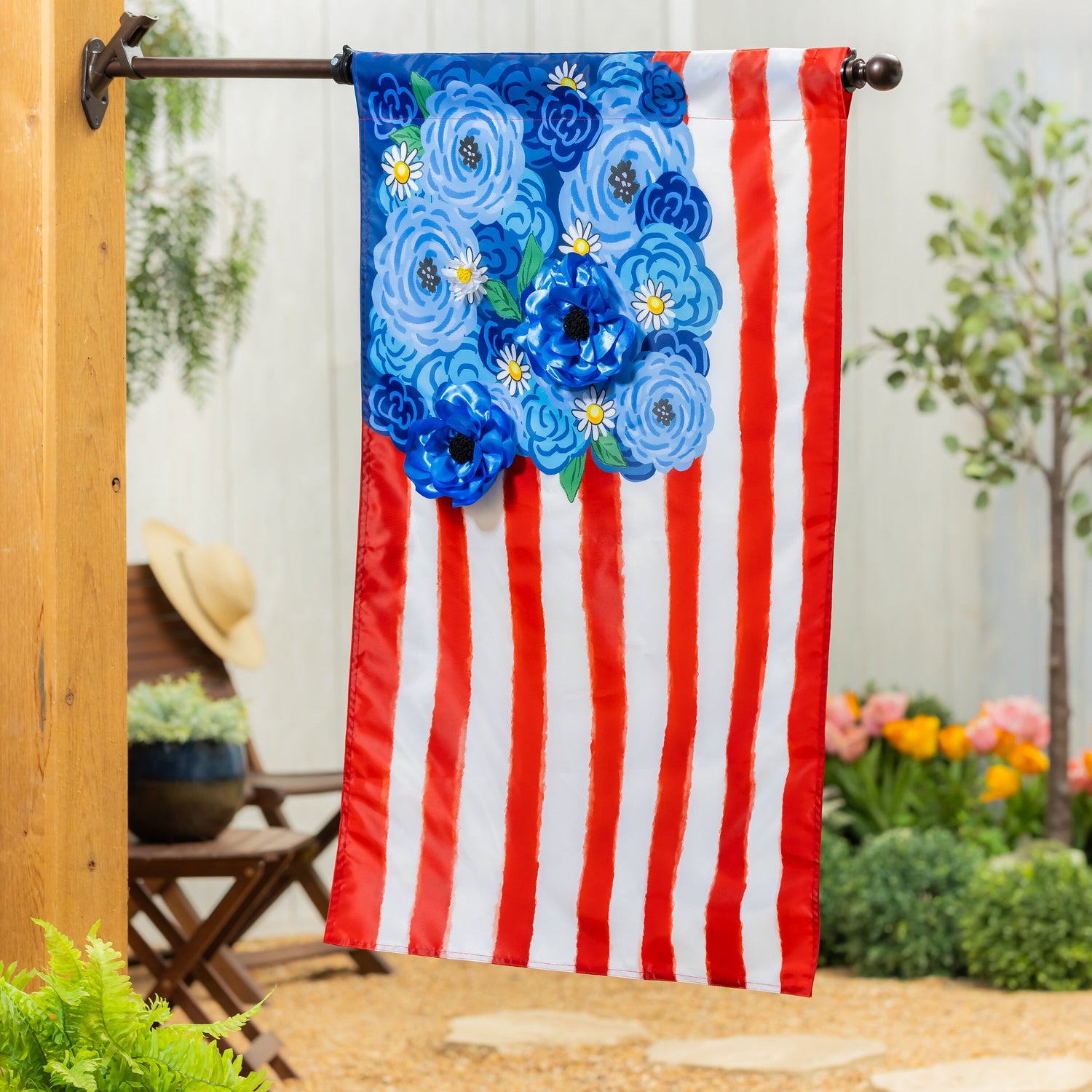 Bursting with bright colors and a detailed, lively design that adds beauty to any space, this flag is perfect for spring and beyond. Hang it in the garden to greet guests, neighbors, and friends. Each Evergreen applique flag is carefully crafted from multiple layers of 310 denier nylon made from recycled plastic that can withstand a variety of weather conditions. We combine pieces of fade-resistant, strong fabric with tight, detailed stitching to create a dimensional mosaic effect. The soft yet heavyweight material illuminates beautifully in sunlight. Each flag features a sleeve that fits standard flagpoles or stands, sold separately. Due to the nature of the packaging, wrinkling may have occurred. Once item is unfolded and mounted on hardware, the creases will naturally fall out. Spot clean only. Never put in a dryer. When not in use, flags can be hung in a closet or placed in a storage container.