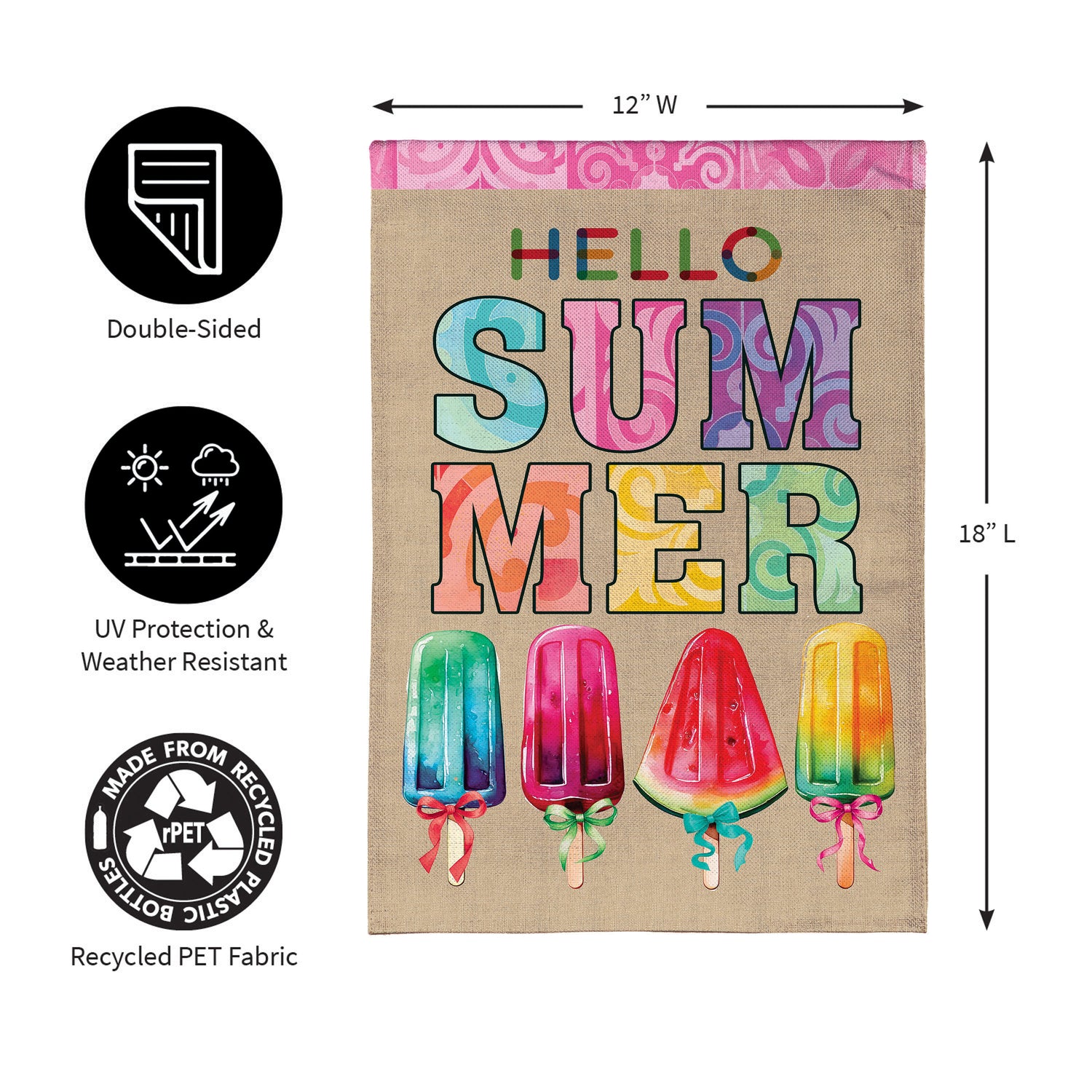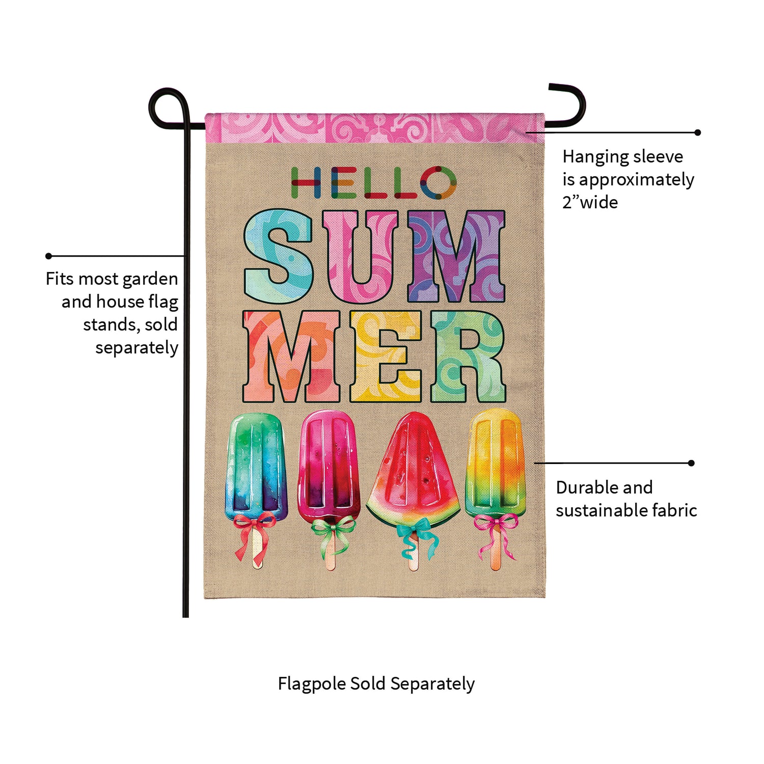 Enjoy the warm rays and cool breezes of summer by relaxing outside on the porch or in the garden. Create a refreshing backyard getaway with the perfect decorations, including this flag. It features vibrant pops of color and rich details, adding cheer and a lively atmosphere to greet friends, family, and neighbors. Crafted of medium-weight, soft polyester burlap fabric, this flag has the look and feel of real burlap. Artwork is heat transferred onto both sides of the textured fabric to create a natural, crafted look. The poly-burlap is a durable and weatherproof material that will not fade or fray after continued use. All flags also feature a sleeve for use with any standard flagpole or stand, sold separately.