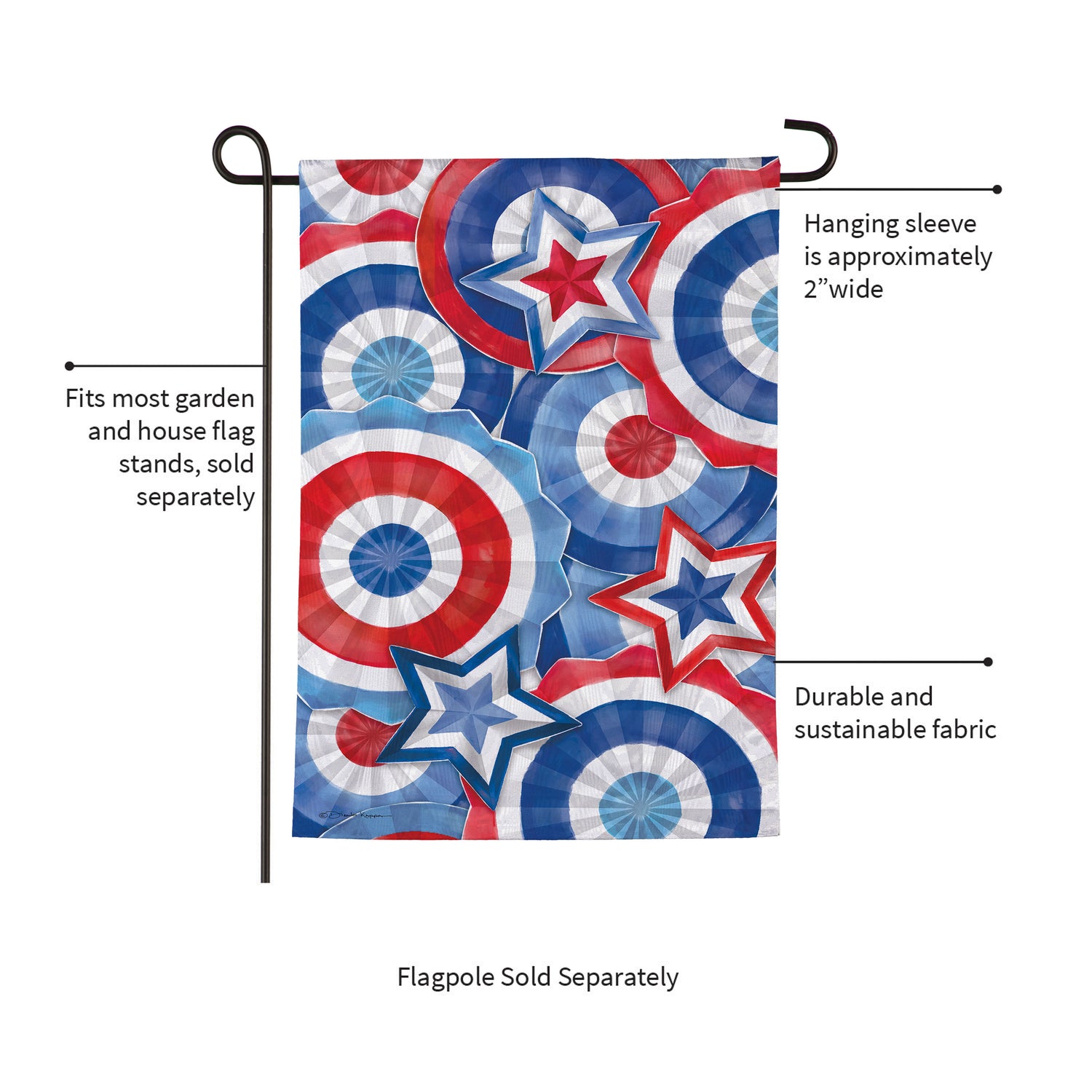 - Fits garden sized flag poles or stands, sold separately.