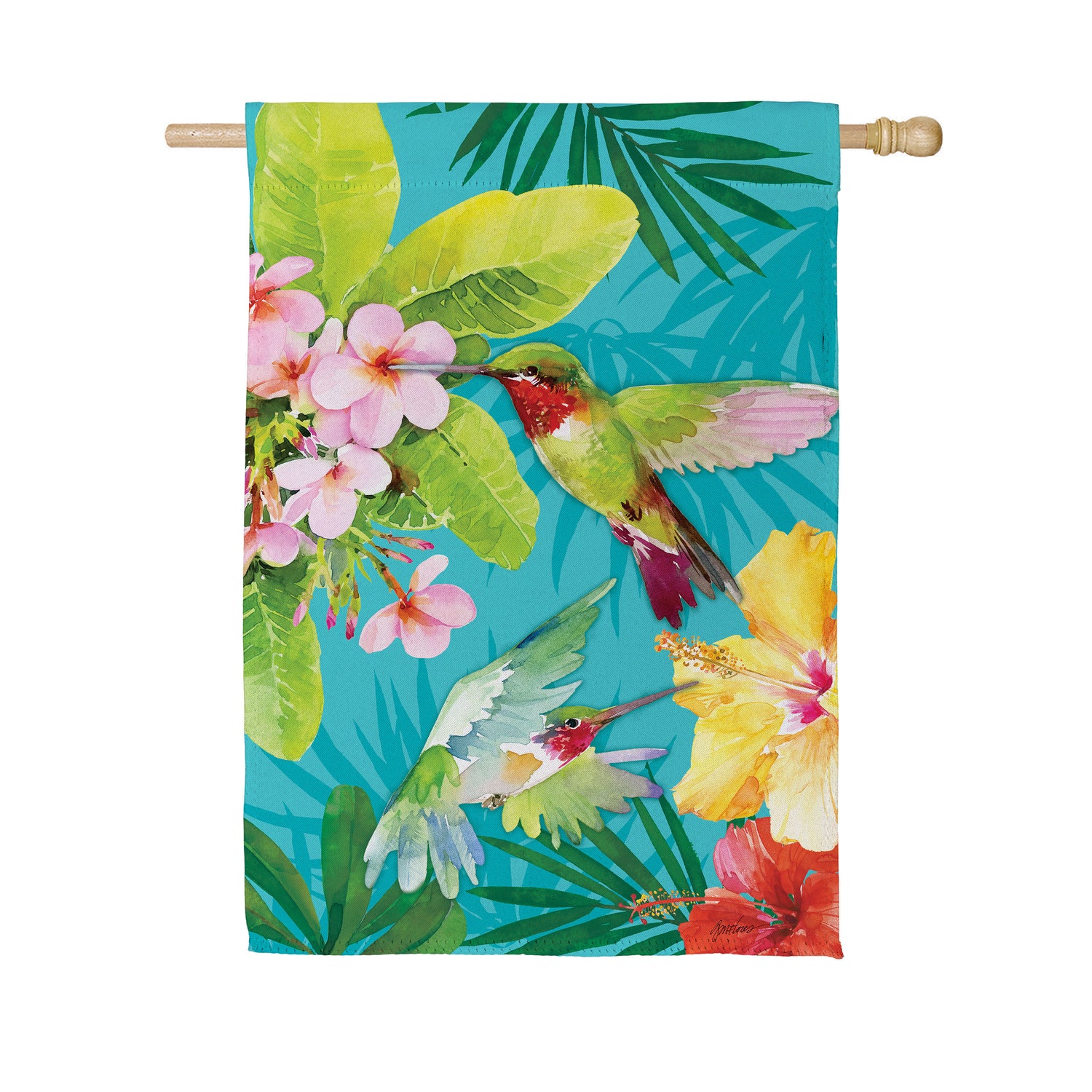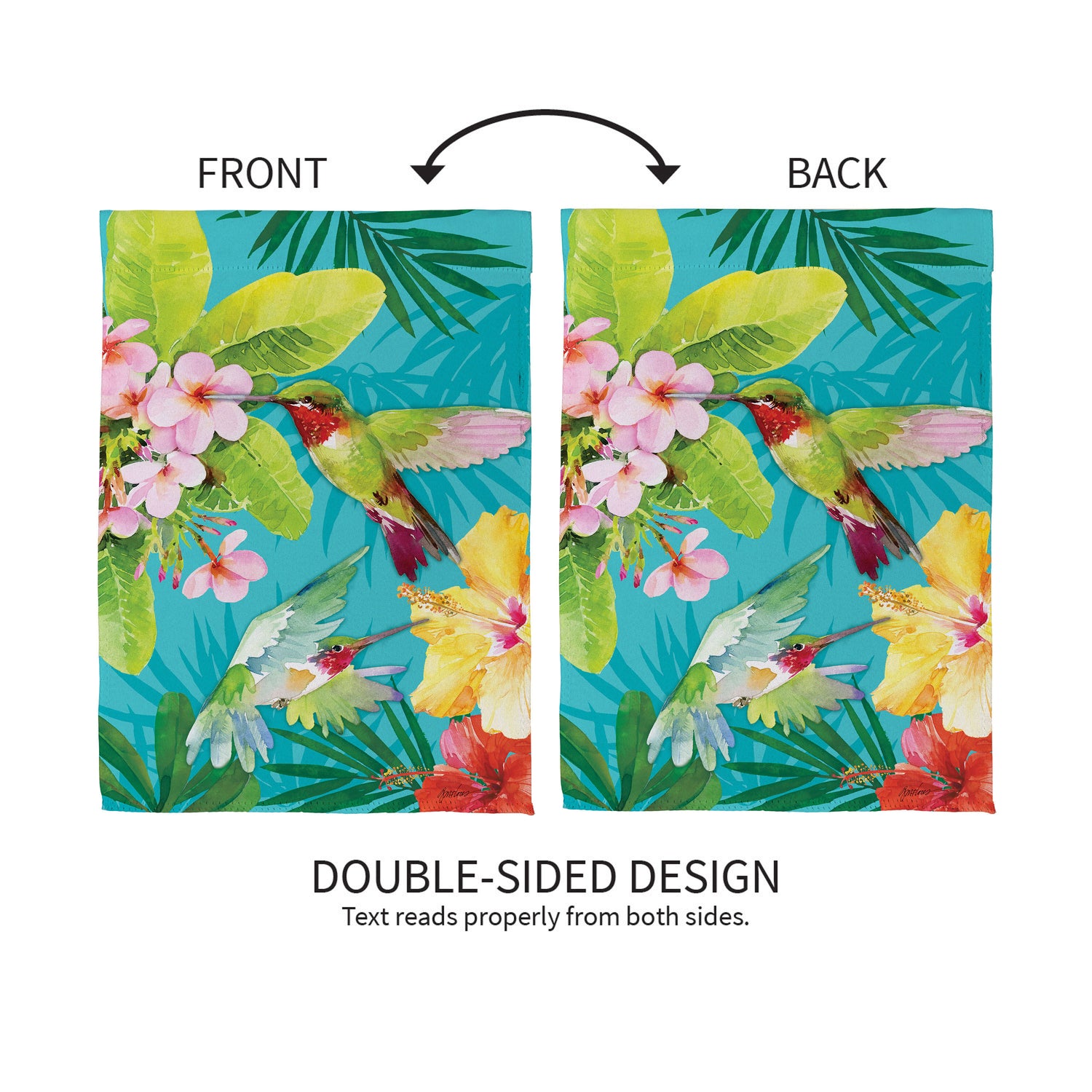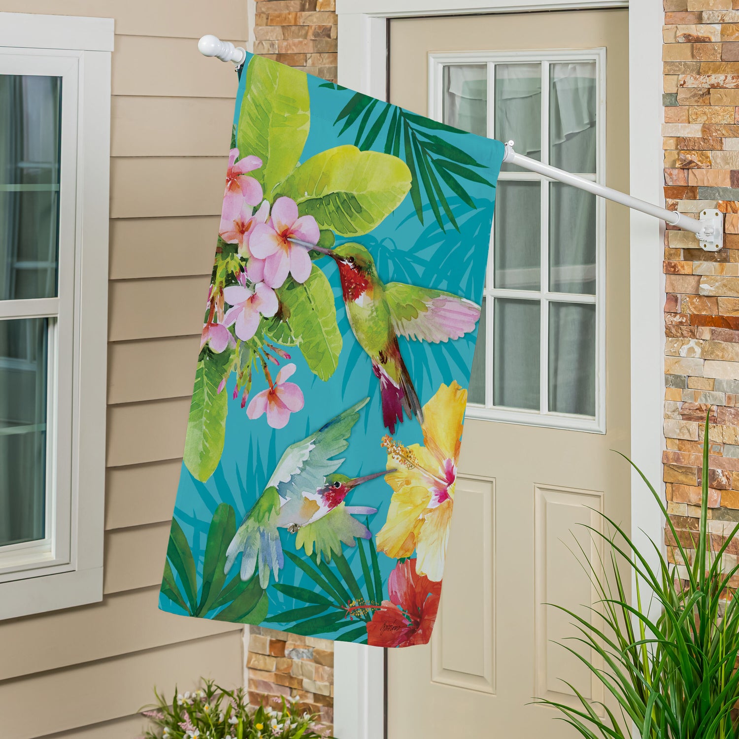 Bursting with bright colors and a detailed, lively design that adds beauty to any space, this flag is perfect for spring and beyond. Hang it in the garden to greet guests, neighbors, and friends. Flag is crafted of medium-weight suede fabric made from recycled plastic that provides a soft and durable texture. Artwork is heat transferred onto the sun-blocking material so that it is easily viewed from both sides. The weatherproof flag will not fray or fade with continued outdoor use. This flag features a sleeve for use with any standard flagpole or stand, sold separately.