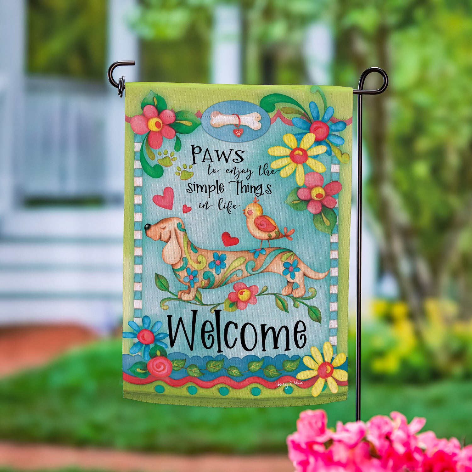 Bursting with bright colors and a detailed, lively design that adds beauty to any space, this flag is perfect for spring and beyond. Hang it in the garden to greet guests, neighbors, and friends. Flag is crafted of medium-weight suede fabric made from recycled plastic that provides a soft and durable texture. Artwork is heat transferred onto the sun-blocking material so that it is easily viewed from both sides. The weatherproof flag will not fray or fade with continued outdoor use. This flag features a sleeve for use with any standard flagpole or stand, sold separately.