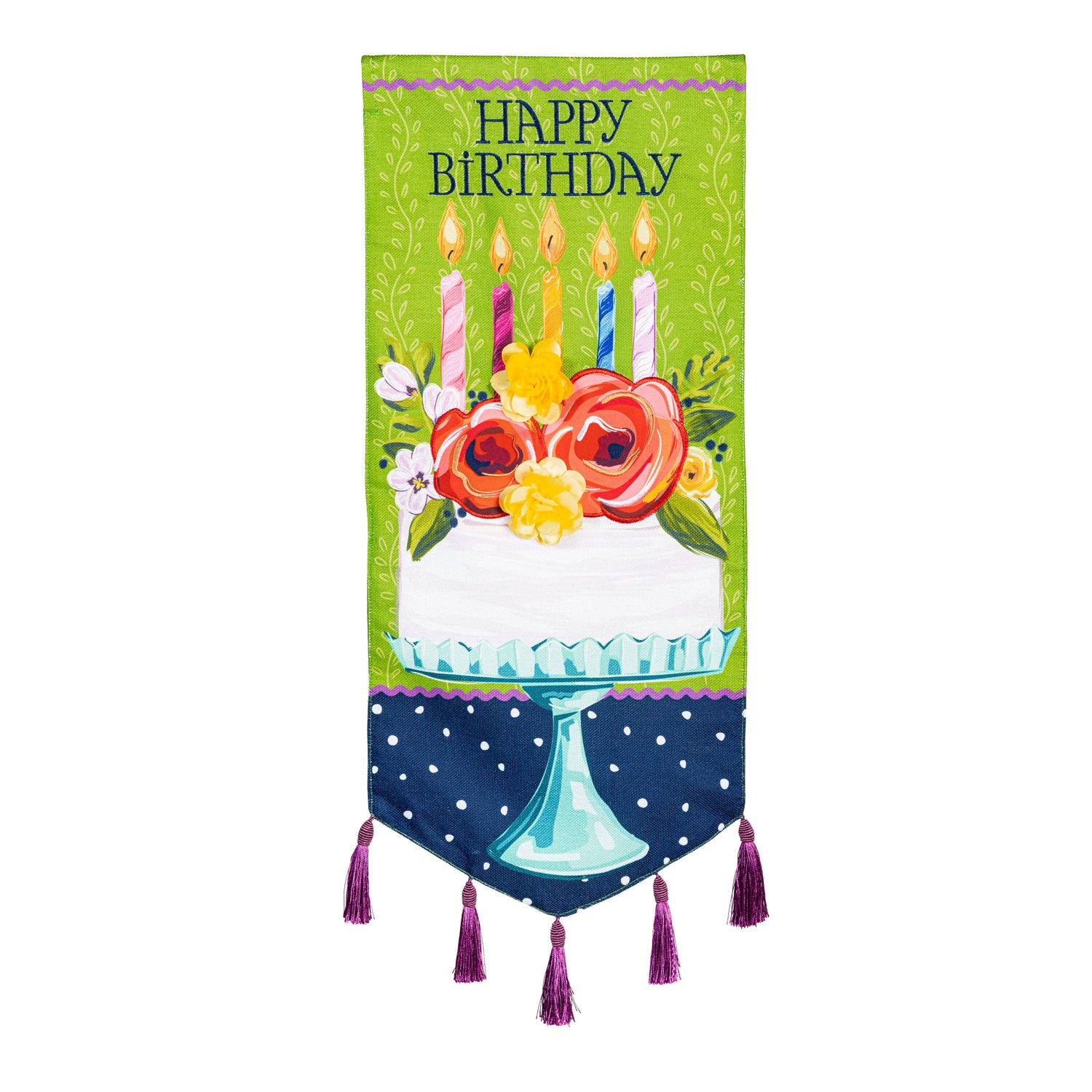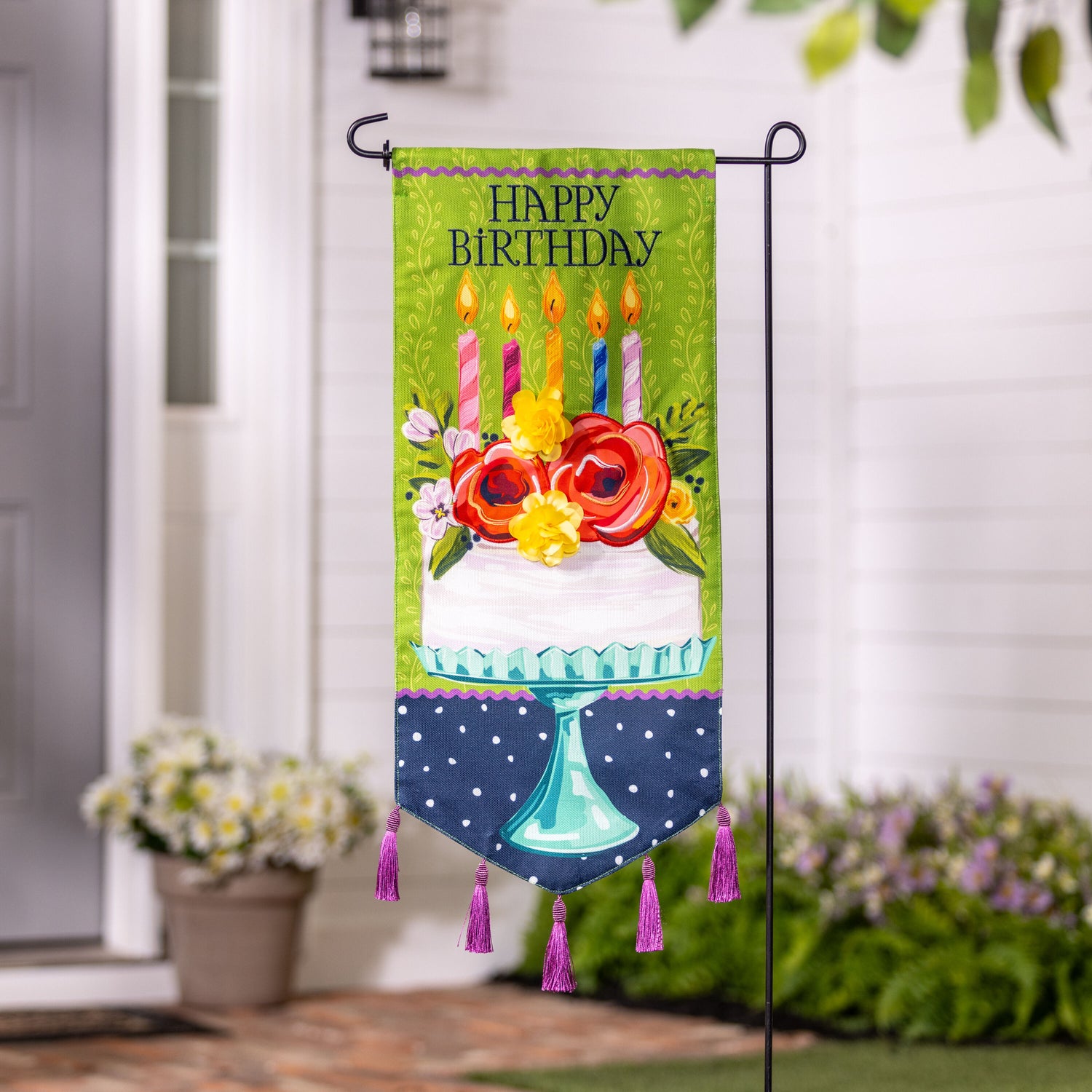 Let the gorgeous design of this Everlasting Impressions Textile Décor add an extra touch of color to any space. With a beautiful design of finches and flowers, this décor piece will bring a unique statement as it greets onlookers in elegant style. These designs are indoor and outdoor safe. Perfect for any space, these pieces can be hung on a door or used with a garden flag stand or dowel. Our double-sided pennants feature a variety of sweet sayings and phrases and are readable from both sides of the banner.