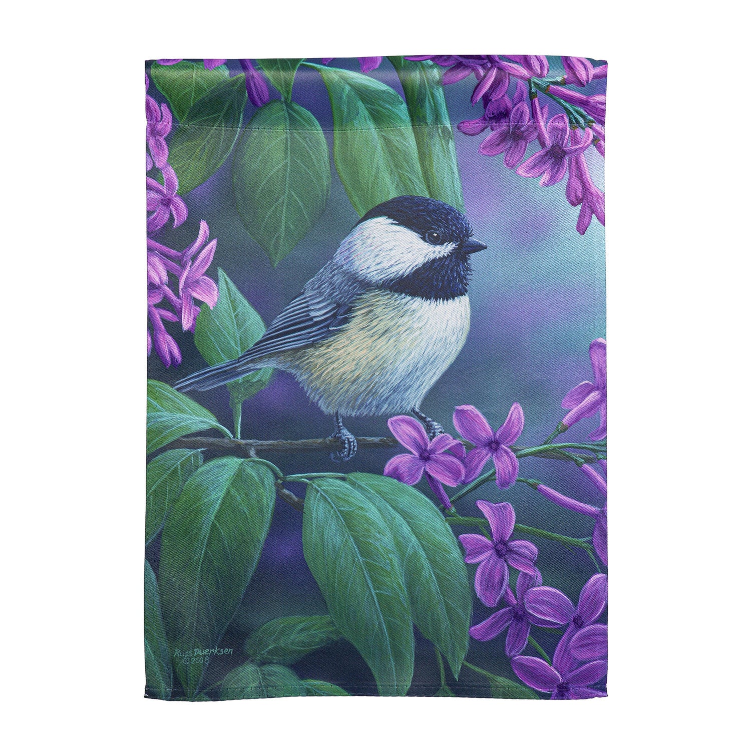 This charming flag adds an extra special touch to any home. It features a beautiful realistic depiction of a chickadee. Flag is crafted of medium-weight suede fabric made from recycled plastic that provides a soft and durable texture. Artwork is heat transferred onto the sun-blocking material so that it is easily viewed from both sides. The weatherproof flag will not fray or fade with continued outdoor use. This flag features a sleeve for use with any standard flagpole or stand, sold separately.