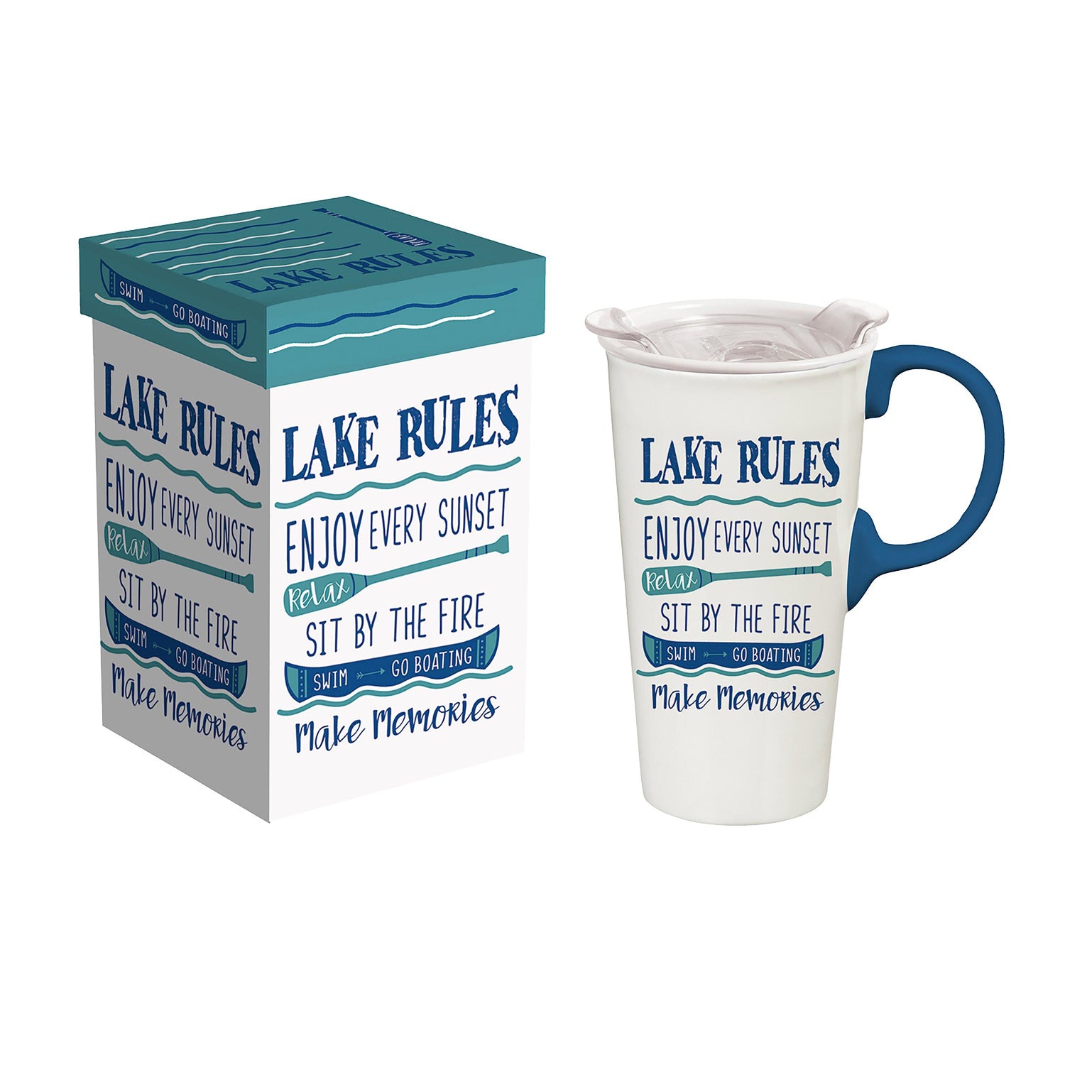 Perfect for an on-the-go lifestyle, this travel cup is a top seller and fan favorite. Follow these Lake Rules for a fun reminder with every morning coffee or afternoon tea. With it's watery blue colors and blue handle, this mug will bring a special touch to morning routines. Crafted from durable ceramic, the mug is covered in charming artwork and holds up to 17 ounces of any beverage. Its three-ring silicone lid fits perfectly into the cup's molded grooves for added security. For quick cleaning and reheating purposes, it's top-rack dishwasher safe and can be microwaved. The cup comes packaged in a beautiful coordinating gift box.