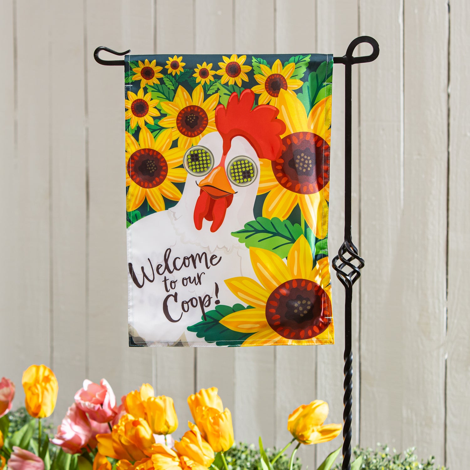 Add whimsy and personality to any garden with this LED garden flag. Featuring an adorable critter with LED eyes that wink, blink, and move to the left and right, the realistic movement brings smiles and joy to everyone who sees them. Beautiful blooming flowers in vibrant colors add the final touches to this piece. This flag is printed on double layered canvas that’s fade resistant to ensure the colors stay bright for years to come. This battery-operated flag requires three AA batteries that will last for months. It has a built-in timer. Each Evergreen Flag applique flag is carefully crafted from multiple layers of 310 denier nylon that can withstand a variety of weather conditions. We combine pieces of fade-resistant, strong fabric with tight, detailed stitching to create a dimensional mosaic effect. The soft yet heavyweight material illuminates beautifully in sunlight. Each flag features a sleeve that fits standard flagpoles or stands, sold separately. Due to the nature of the packaging, wrinkling may have occurred. Once item is unfolded and mounted on hardware, the creases will naturally fall out. Spot clean only. Never put in a dryer. When not in use, flags can be hung in a closet or placed in a storage container.