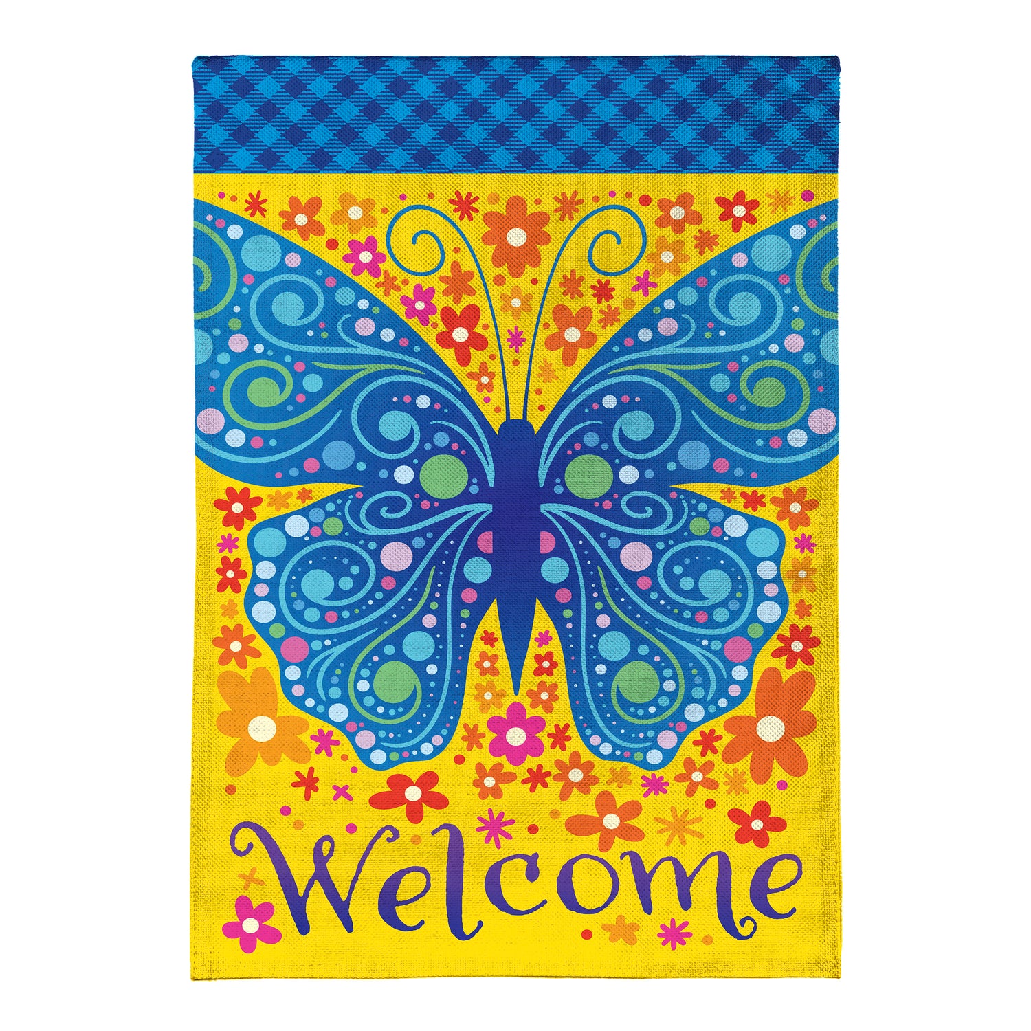 Welcome Mosaic Blue Butterfly Burlap Garden Flag