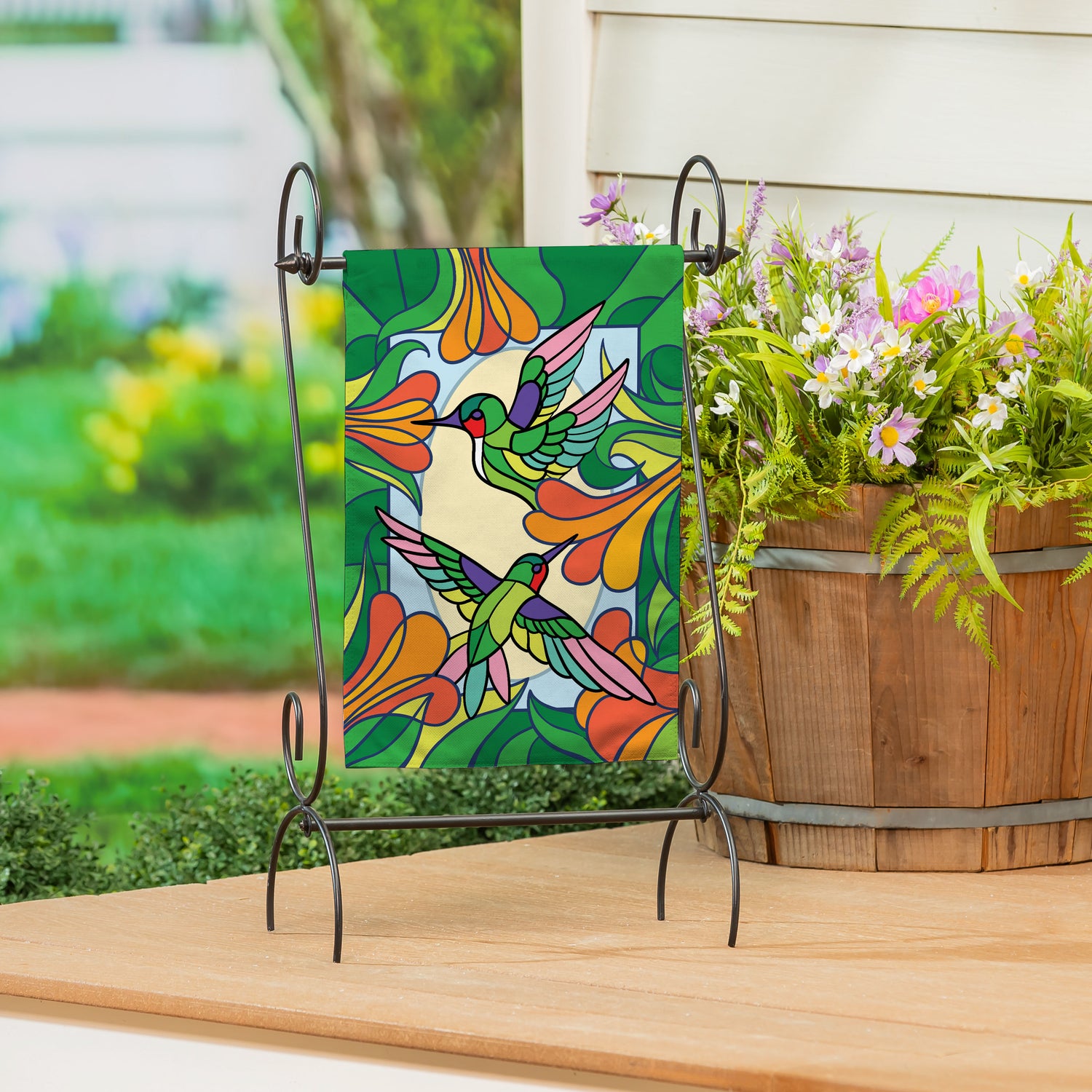 Stained Glass Hummingbirds Burlap Garden Flag
