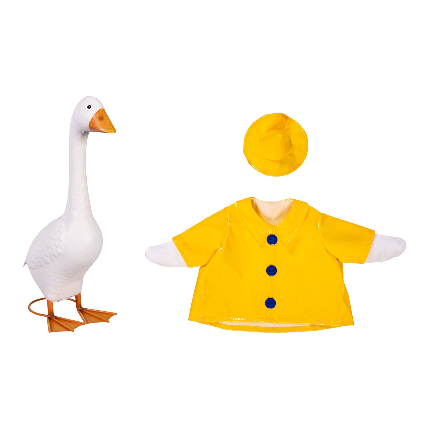 Rain, Rain, Go Away! Our porch goose, Giddy, is all dressed up to splash in the puddles with a bright yellow raincoat and matching hat. This charming bundle adds personality, fun, and flair to any outdoor décor. Giddy greets guests in style as they approach the home, making a delightful first impression. The best part? She’s easy to dress, and both the goose and outfit are weather-friendly, so everyone can enjoy them year after year. This bundle is perfect for anyone starting their porch-goose collection, or adding to it. Once everyone sees how cute Giddy looks, they won’t want to stop at just one outfit!