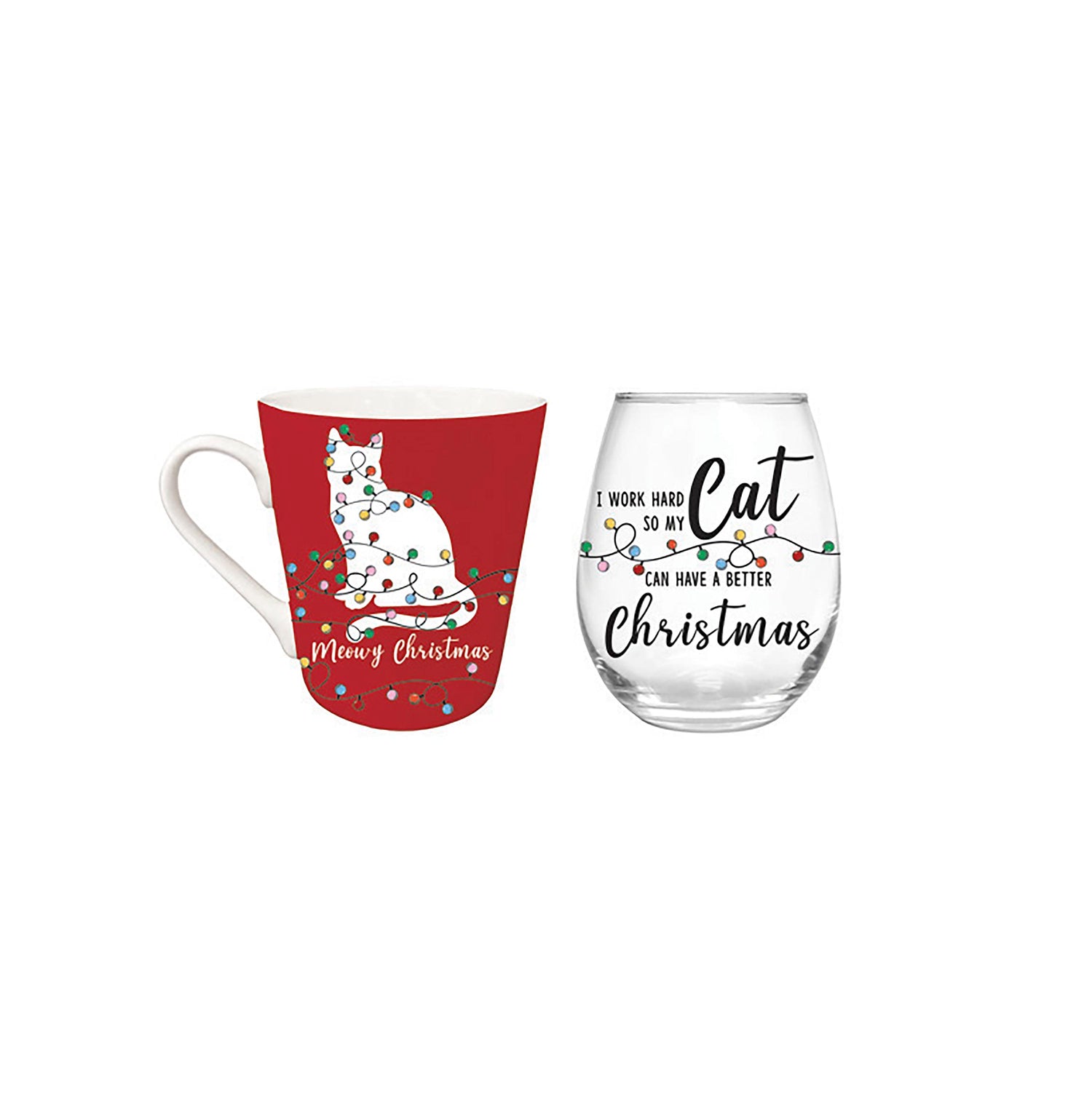 Have coffee and wine at the ready with this set. It includes a 12-ounce flare cup with an adorable kitten covered in Christmas lights and a punny “Meowy Christmas” saying. The stemless wine glass holds up to 17 ounces and has a funny message that ready “I work hard so my cat can have a better Christmas.” Start the morning off with a cup of coffee and end it with a relaxing glass of wine. This makes the perfect gift for anyone who loves their cat. These cups are made from quality material and should be hand washed only.