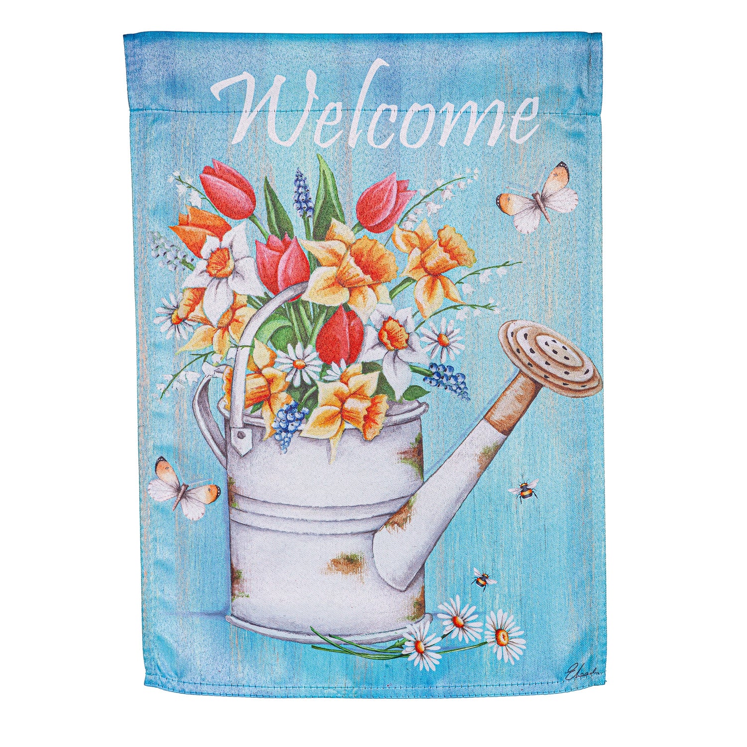 This Welcome Flowers Suede Garden Flag brings a beautiful statement to any garden. Featuring a beautiful bouquet surrounded by butterflies, this piece is the perfect addition to the home. This Suede Reflections flag is made of medium-weight, polyester suede that provides a soft and durable texture. Artwork is heat transferred onto the sun-blocking material so that it is easily viewed from both sides. The weatherproof poly-suede will not fray or fade with continued outdoor use. This flag features a sleeve for use with any standard flagpole or stand, sold separately.