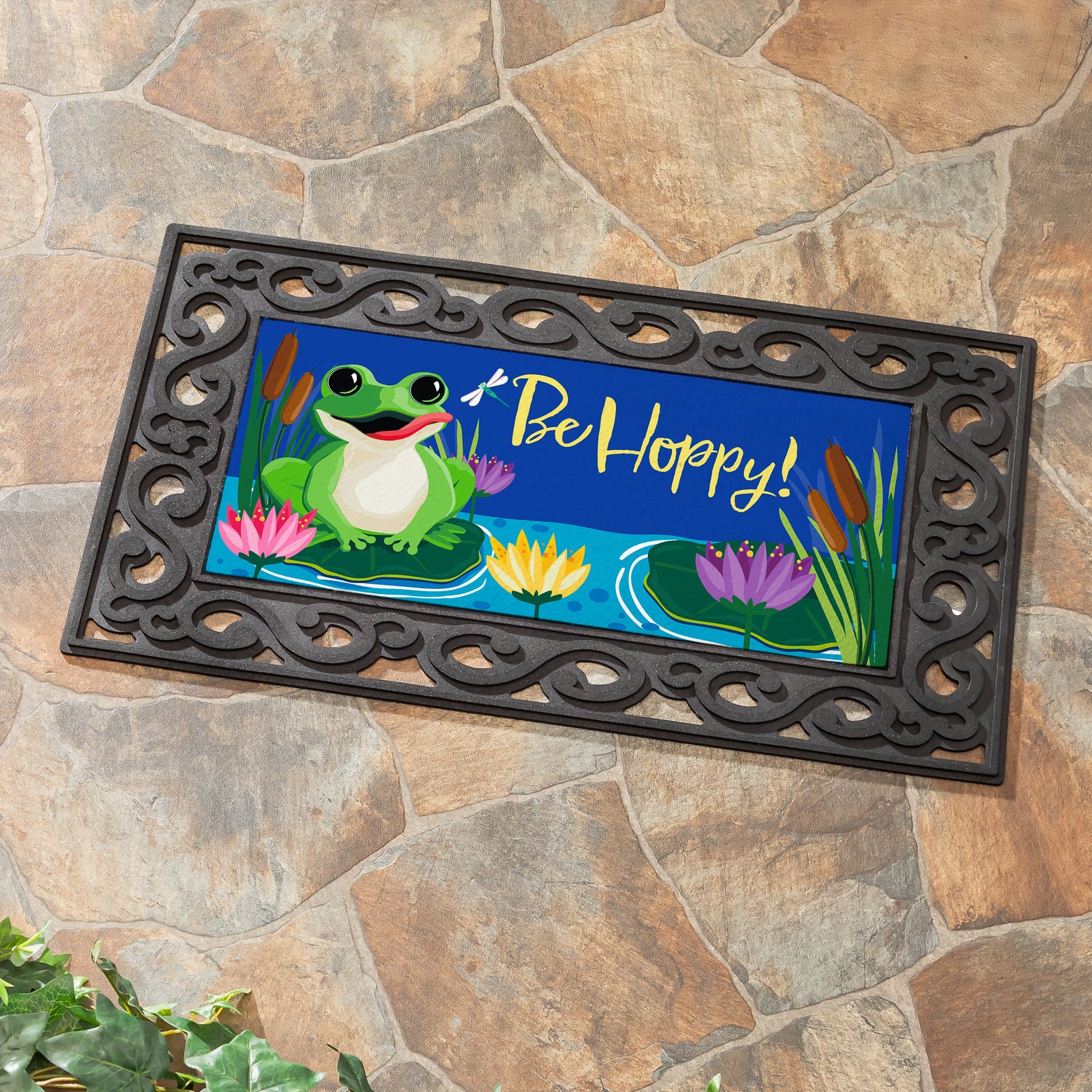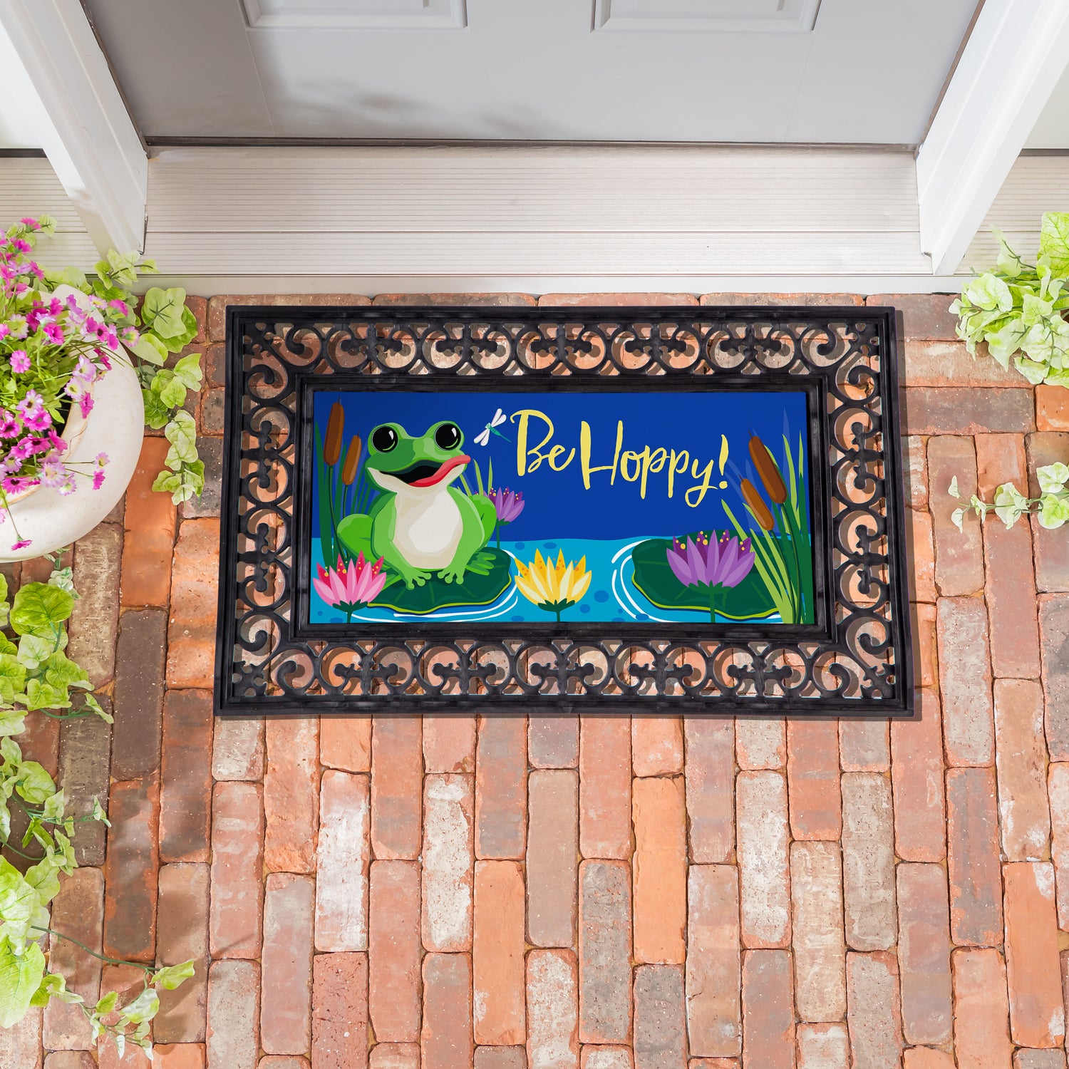 Sweep guests off their feet with our beautifully made Sassafras mats! Made with bright pops of color that are perfect for the season, this mat will put pep in anyone's step. Crafted from heat-sublimated polyester with a rubber backing, this versatile mat is designed to fit perfectly within Evergreen's switch doormat bases. The mildew resistant mat is ideal for indoor or outdoor use and features a skid-resistant backing to help keep it in place. This welcoming mat will freshen up your stoop season after season while ensuring your home stays debris-free. For stains, simply spot clean with soap and warm water.