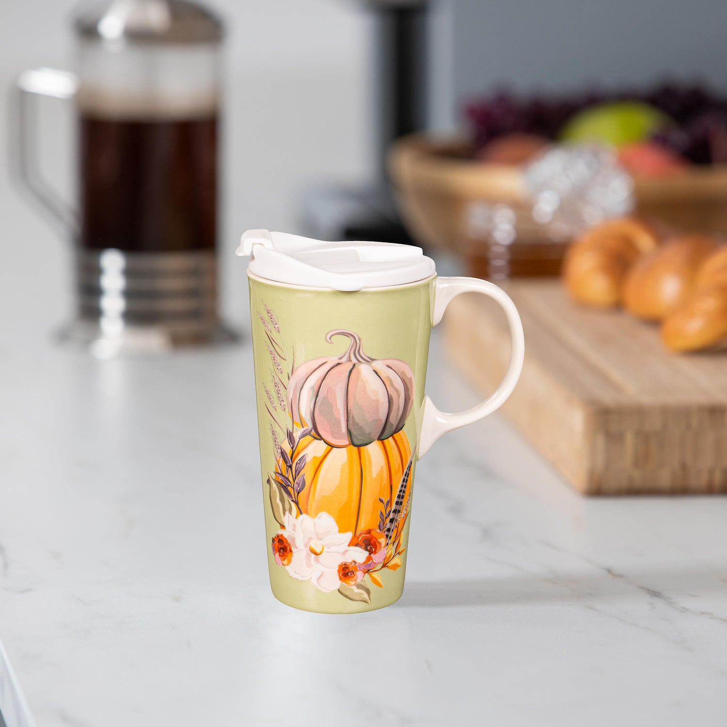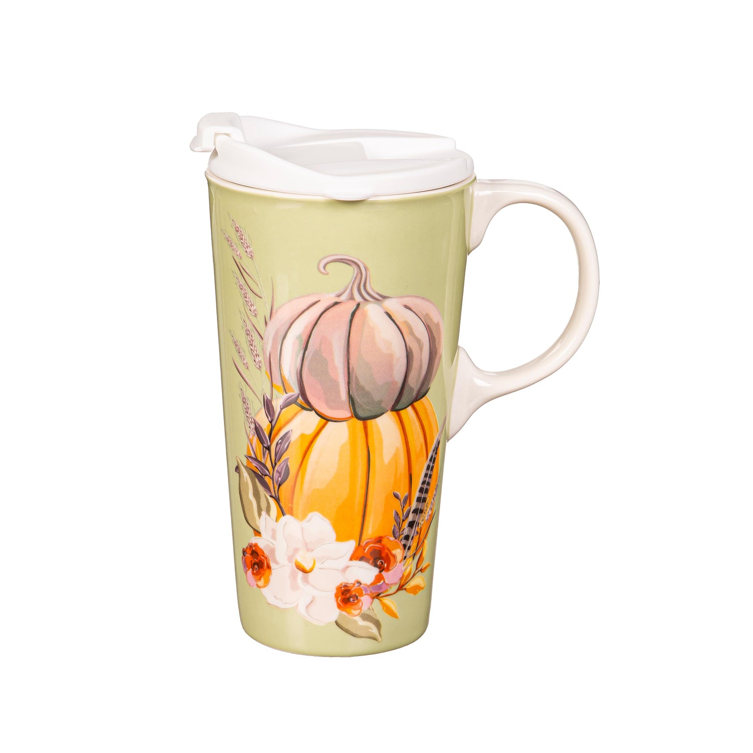 Sip in style with this Harvest Pumpkins and Magnolia Ceramic Perfect Travel Cup. Pull this cup out for the fall season. It features an elegant design with stacked pumpkins with floral accents. Perfect for an on-the-go lifestyle, this travel cup is a top seller and fan favorite. Crafted from durable ceramic, this mug will last season after season. It holds up to 17 ounces of any beverage. Its three-ring silicone lid fits perfectly into the cup’s molded grooves for added security. For quick cleaning and reheating purposes, it’s top-rack dishwasher safe and can be microwaved. The cup comes packaged in a beautiful coordinating gift box.