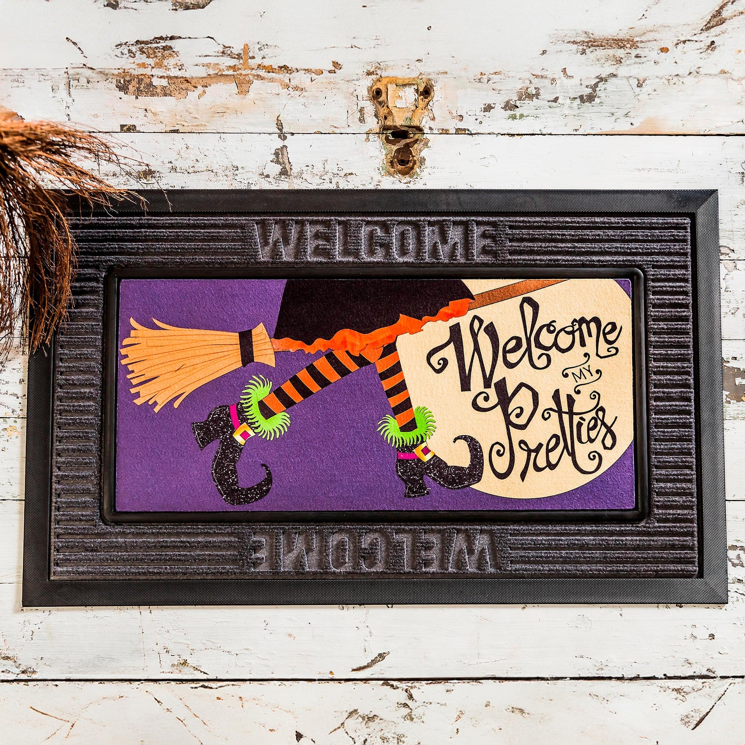 This Welcome My Pretties Sassafras Switch Mat will make a sweet statement wherever it's displayed. The durable insert is created for placement in a Sassafras mat frame or tray, sold separately. Swap mats seasonally to keep things fresh and fun. The charming design is heat sublimated onto the polyester and rubber insert. Suitable for indoor and outdoor use, the floor mat can also be used on its own as a stair tread or small floor mat. It is mildew resistant and features an anti-slip backing. Spot clean with soap and warm water or hose down. For best results, display your mat in a covered or sheltered area to prevent fading.