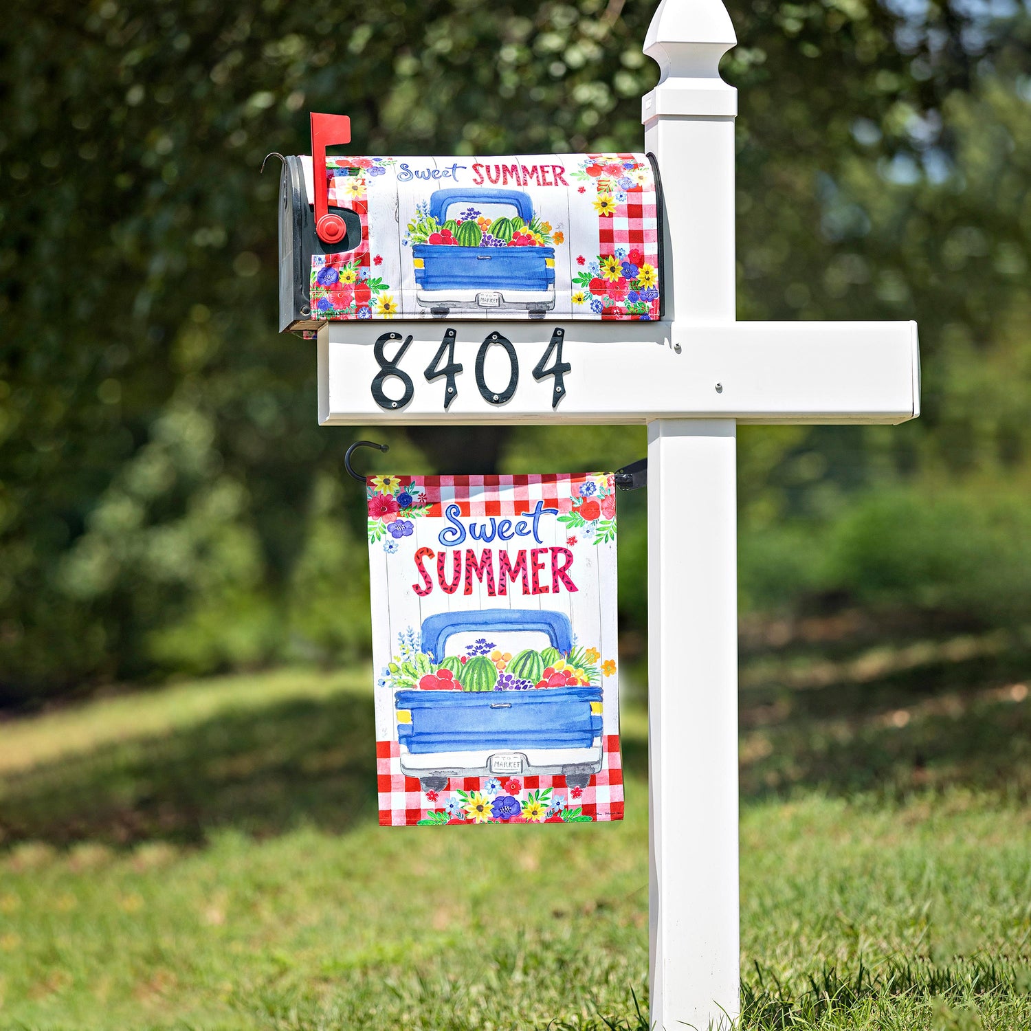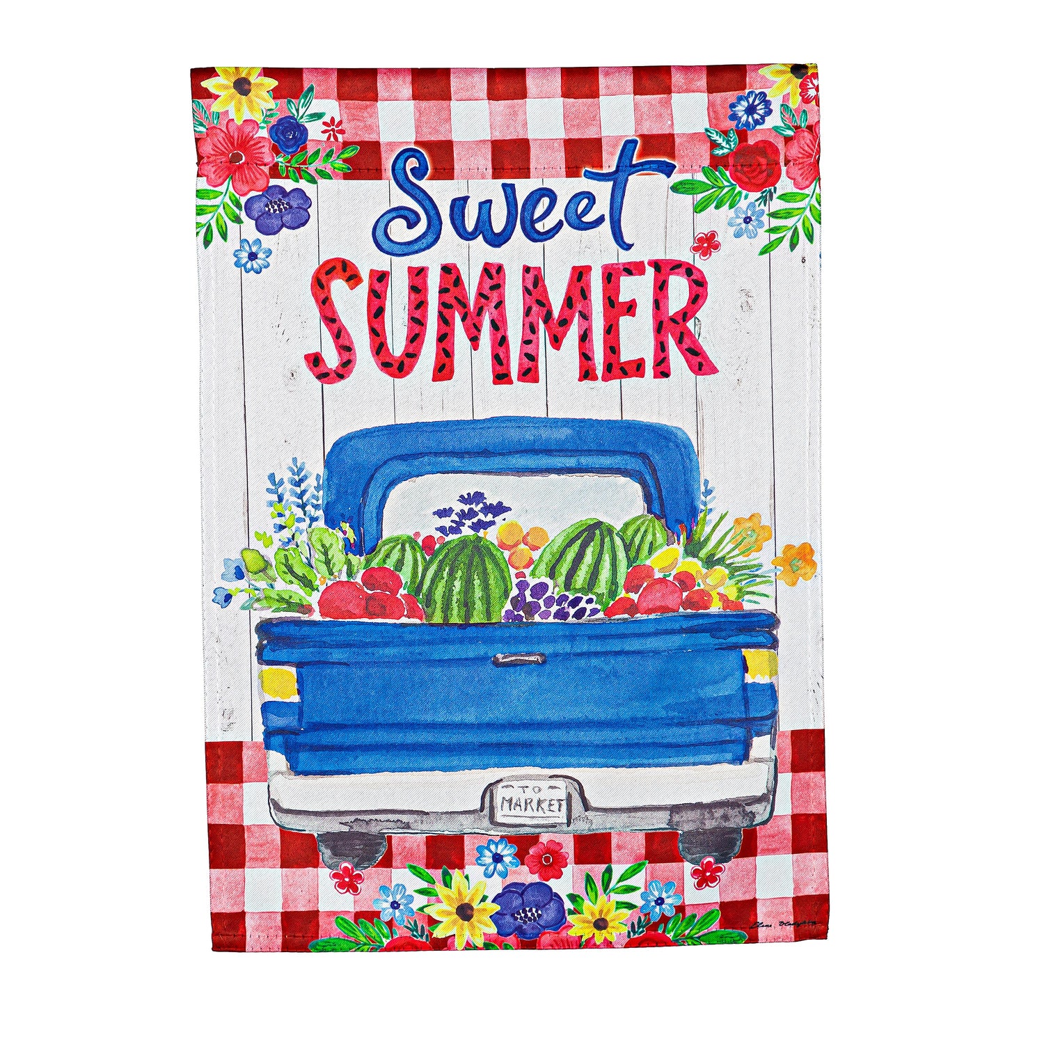 Indulge in summer fun and display the juicy colors of this Sweet Summer Truck Garden Suede Flag. With a red gingham border, this playful flag features a blue truck hauling a load of summer fruits for a lively design that is sure to freshen up any space for the season. Floral details and vibrant, saturated colors create a striking statement! The eye-catching artwork is carefully heat transferred onto sun-blocking material, resulting in a beautiful, high-quality finished product. Each Suede Reflections flag is made of weatherproof polyester suede that is soft yet durable. Our attention to detail and level of craftsmanship ensure that the flag won't fade or fray, even with continued outdoor use.
