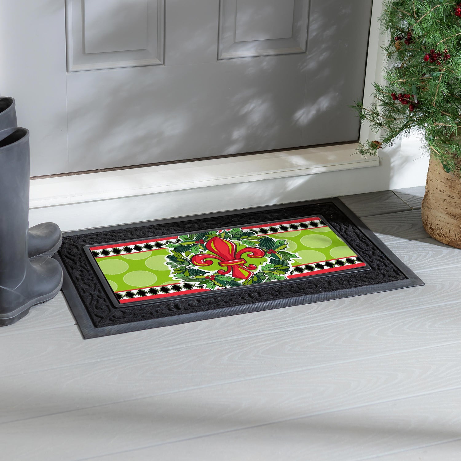 Celebrate the season with a bold and festive welcome using this Fleur-de-Lis Holiday Insert Mat.Featuring a vibrant red fleur-de-lis framed by lush holly leaves, bright green polka dots, and classic holiday accents, this cheerful design brings a touch of Southern charm to your entryway. The lively colors and decorative pattern make it a standout addition to your holiday décor while warmly greeting guests at the door.Designed to fit inside a coordinating rubber tray, the durable insert helps keep dirt and moisture outside while adding seasonal style to your porch, patio, or front step.