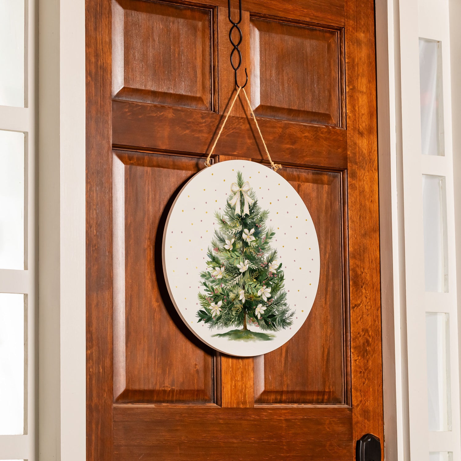 Elevate holiday decor with our Christmas Tree door decor. This beautifully designed piece features a lush green tree adorned with delicate white flowers and elegant bows, set against a backdrop of soft, golden polka dots. Perfect for enhancing any festive home, this piece adds a touch of sophistication to any space. Crafted with high-quality materials, it comes with a convenient hanging loop. Celebrate the season in style with this charming addition to any holiday collection.