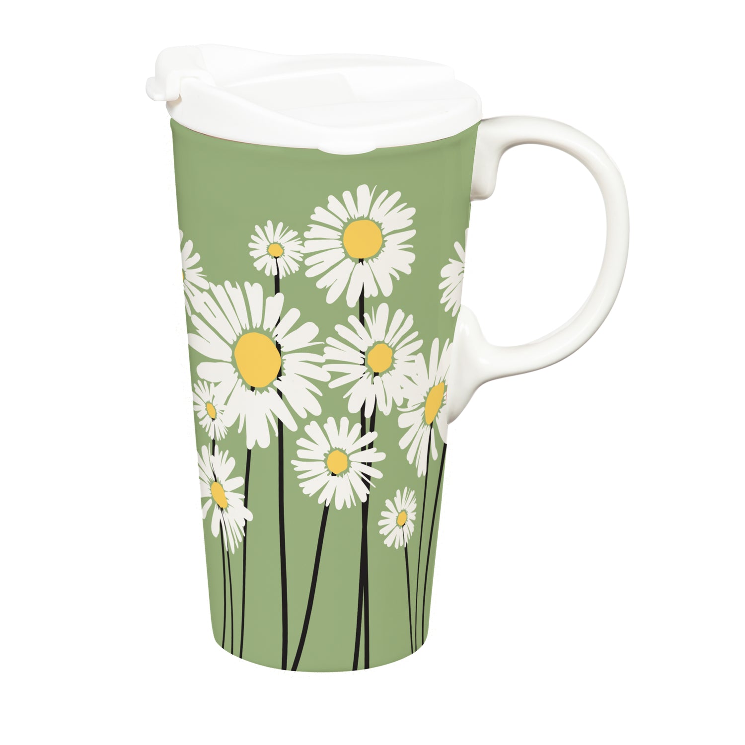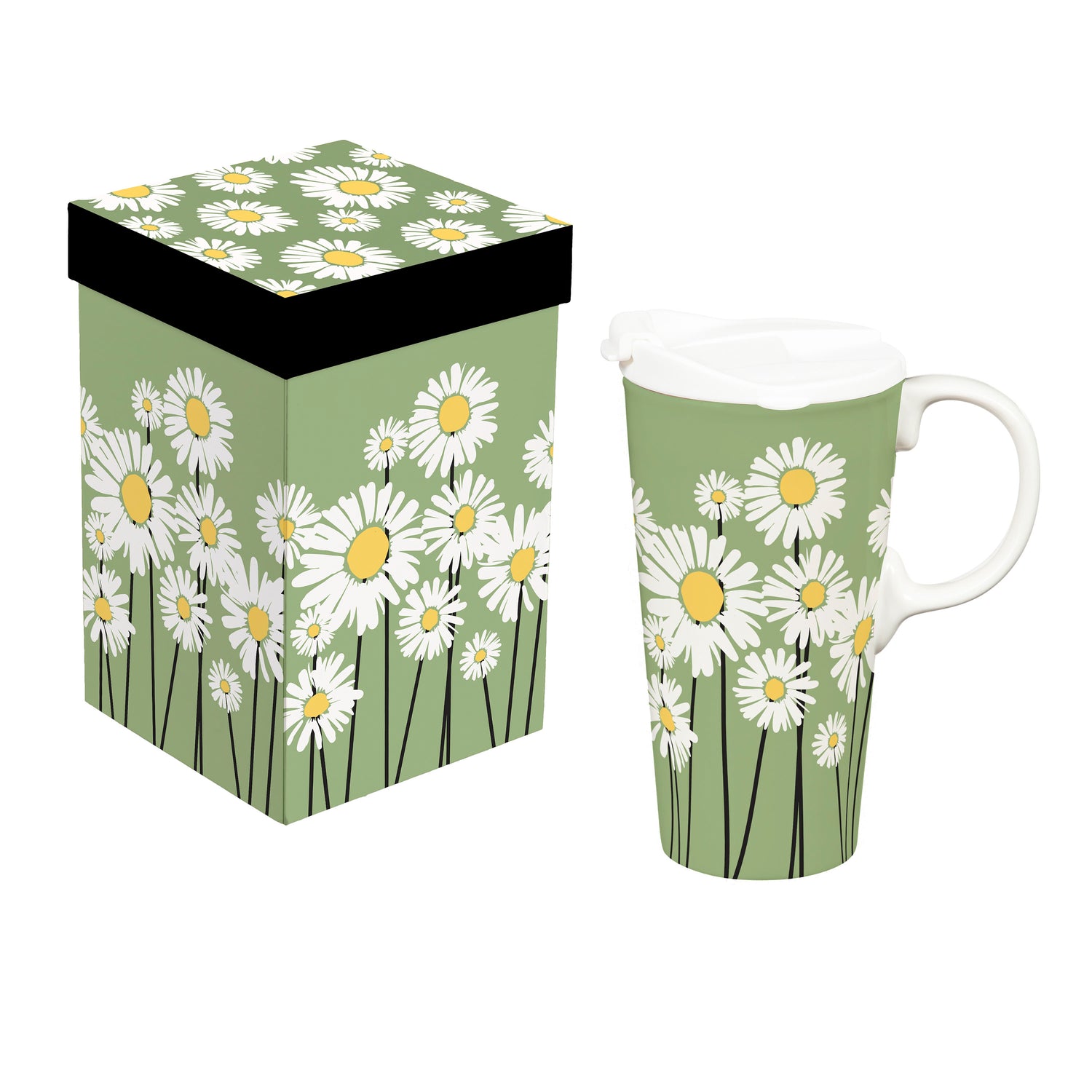 Enjoy a cup of coffee even on the busiest mornings with our Perfect Cup. Crafted from durable ceramic, the mug is covered in charming artwork that adds personality and holds up to 17 ounces of any beverage. Its three-ring silicone lid fits perfectly into the cups molded grooves for added security. For quick cleaning and reheating purposes, its top-rack dishwasher safe and can be microwaved. The cup comes packaged in a beautiful coordinating gift box.