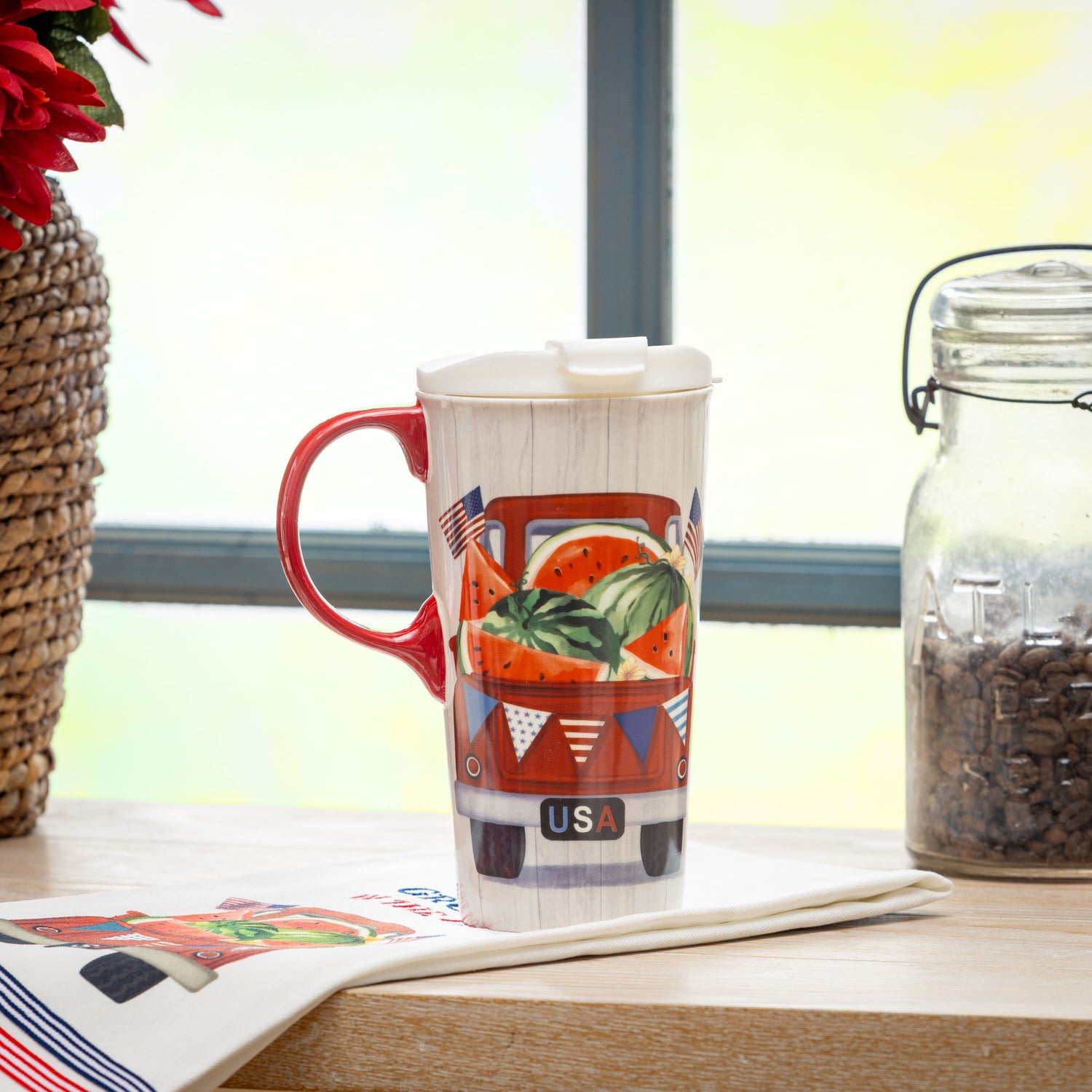 Enjoy a cup of coffee even on the busiest mornings with our Perfect Cup. Crafted from durable ceramic, the mug is covered in charming artwork that adds personality and holds up to 17 ounces of any beverage. Its three-ring silicone lid fits perfectly into the cups molded grooves for added security. For quick cleaning and reheating purposes, its top-rack dishwasher safe and can be microwaved. The cup comes packaged in a beautiful coordinating gift box.