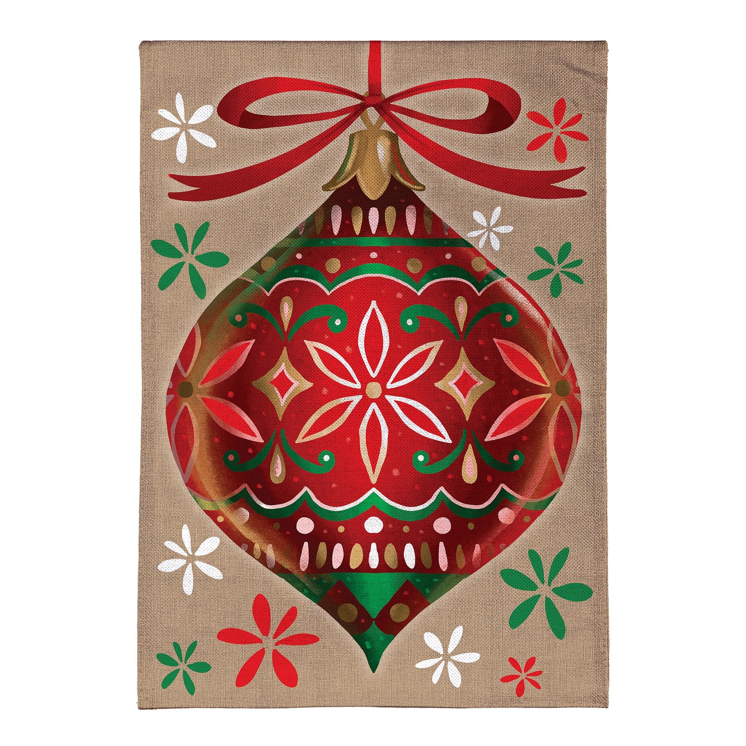 Add magic and wonder to any garden or yard when you hang up this beautiful flag. Featuring an ornament with a whimsical design, this flag is perfect for the festive season. This flag is made of medium-weight, soft burlap fabric that's made from recycled plastic that has the look and feel of real burlap. Artwork is heat transferred onto both sides of the textured fabric to create a natural, crafted look. The flag is durable and weatherproof and will not fade or fray after continued display. This flag features a sleeve for use with any standard flagpole or stand, sold separately.