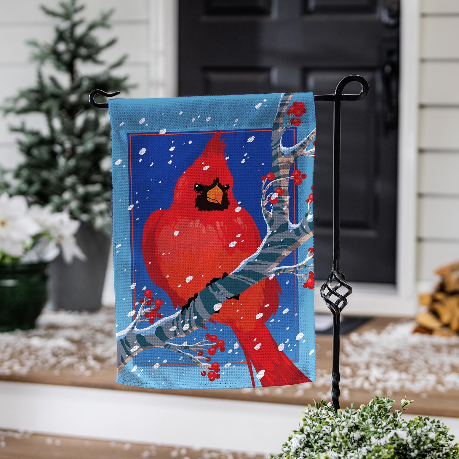 Add magic and wonder to any garden or yard when you hang up this beautiful flag. Featuring a cardinal perched on a snow branch, this flag is perfect for the festive season. This flag is made of medium-weight, soft burlap fabric that's made from recycled plastic that has the look and feel of real burlap. Artwork is heat transferred onto both sides of the textured fabric to create a natural, crafted look. The flag is durable and weatherproof and will not fade or fray after continued display. This flag features a sleeve for use with any standard flagpole or stand, sold separately.