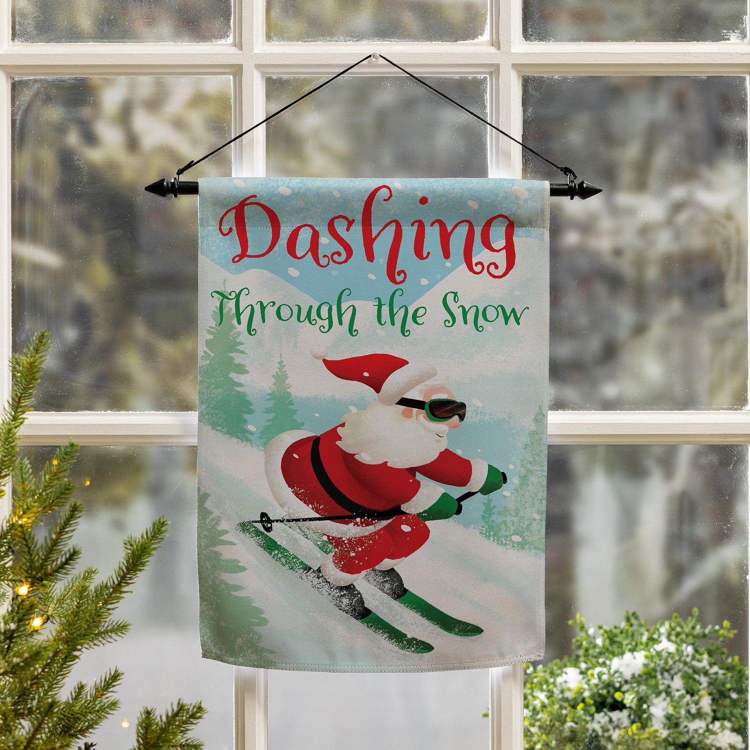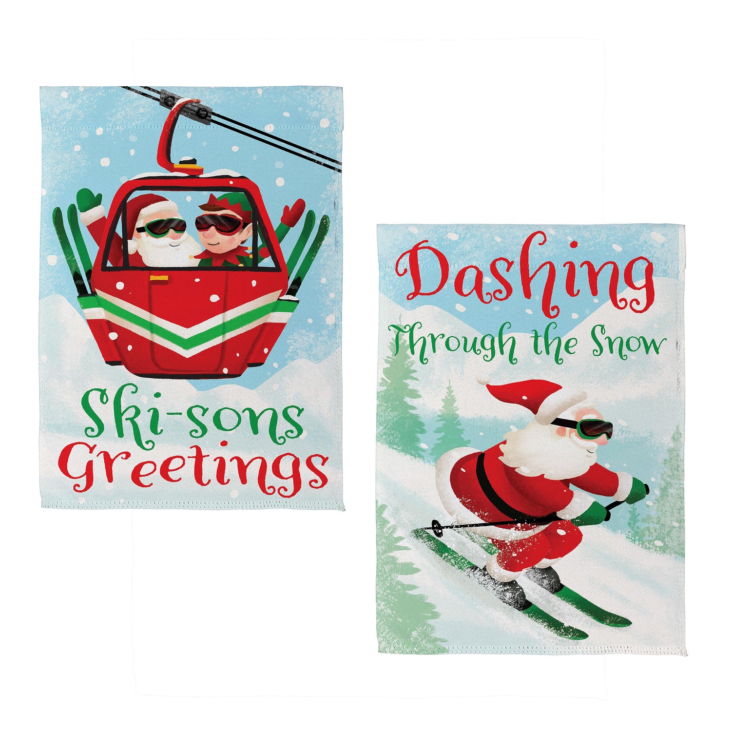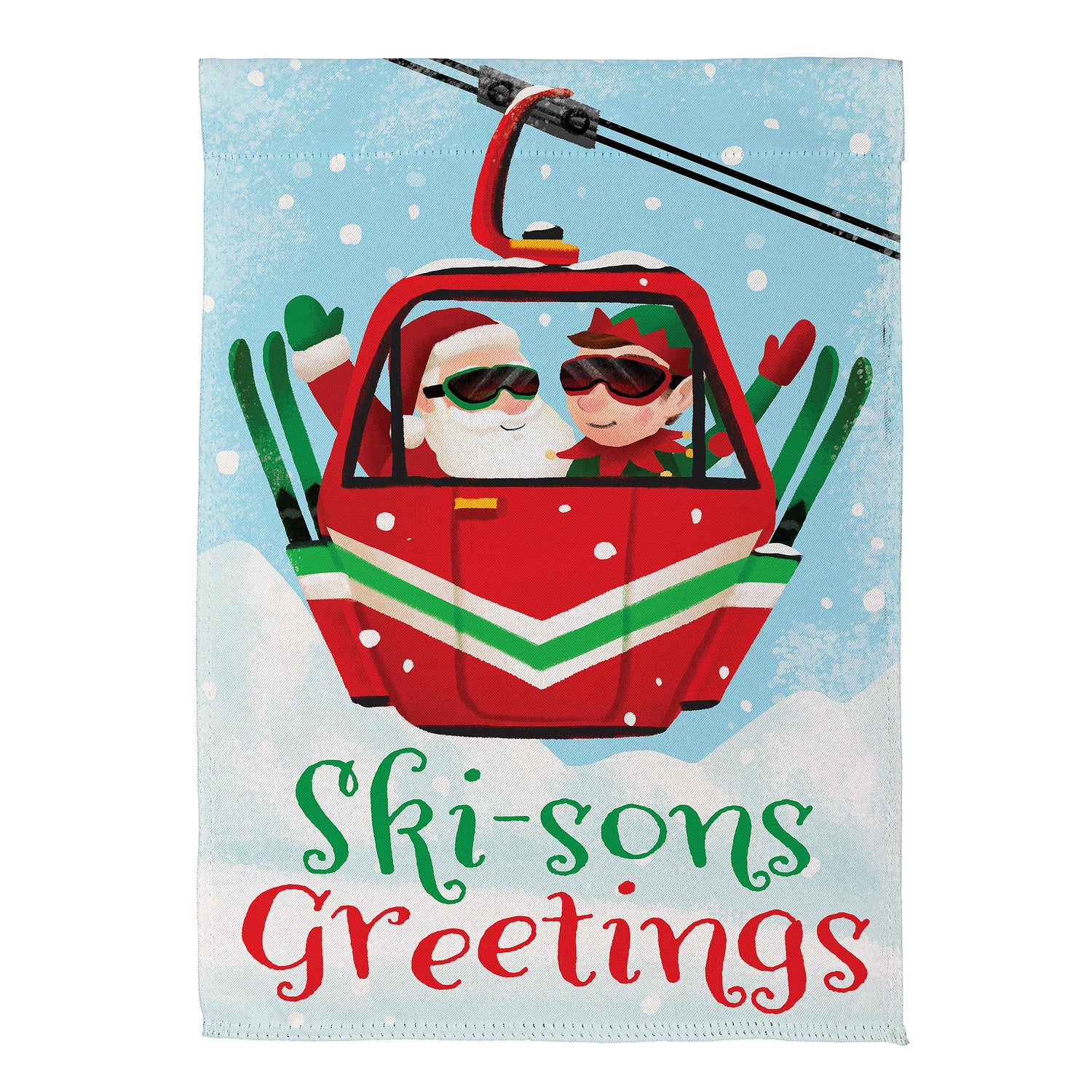 Add magic and wonder to any garden or yard when you hang up this beautiful flag. Featuring Santa’s ski trip and playful messaging, this flag is perfect for the festive season. Flag is crafted of medium-weight suede fabric made from recycled plastic that provides a soft and durable texture. Artwork is heat transferred onto the sun-blocking material so that it is easily viewed from both sides. The weatherproof flag will not fray or fade with continued outdoor use. This flag features a sleeve for use with any standard flagpole or stand, sold separately.