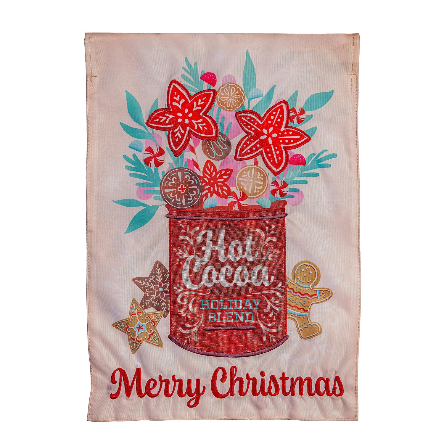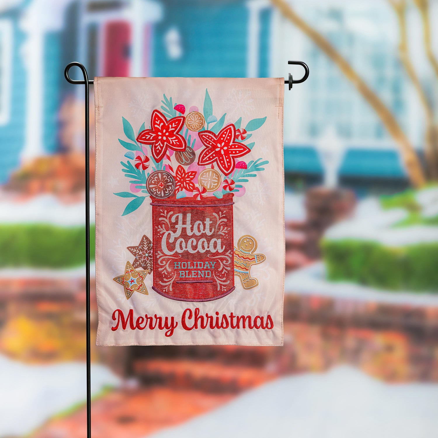 Add magic and wonder to any garden or yard when you hang up this beautiful flag. Featuring a cozy hot coco tin filled with a bouquet of foliage and treats, this flag is perfect for the festive season. Each Evergreen applique flag is carefully crafted from multiple layers of 310 denier nylon made from recycled plastic that can withstand a variety of weather conditions. We combine pieces of fade-resistant, strong fabric with tight, detailed stitching to create a dimensional mosaic effect. The soft yet heavyweight material illuminates beautifully in sunlight. Each flag features a sleeve that fits standard flagpoles or stands, sold separately. Due to the nature of the packaging, wrinkling may have occurred. Once item is unfolded and mounted on hardware, the creases will naturally fall out. Spot clean only. Never put in a dryer. When not in use, flags can be hung in a closet or placed in a storage container.