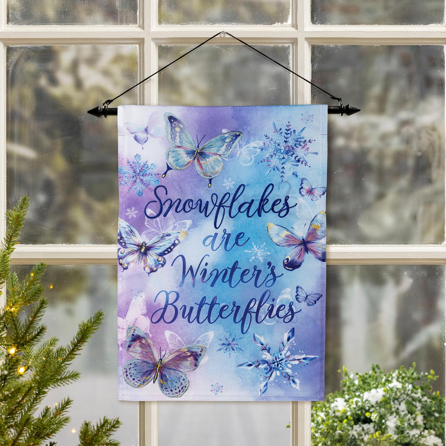 Add magic and wonder to any garden or yard when you hang up this beautiful flag. Featuring a pastel background with butterflies and snowflakes, this flag is perfect for the festive season. Each Evergreen applique flag is carefully crafted from multiple layers of 310 denier nylon made from recycled plastic that can withstand a variety of weather conditions. We combine pieces of fade-resistant, strong fabric with tight, detailed stitching to create a dimensional mosaic effect. The soft yet heavyweight material illuminates beautifully in sunlight. Each flag features a sleeve that fits standard flagpoles or stands, sold separately. Due to the nature of the packaging, wrinkling may have occurred. Once item is unfolded and mounted on hardware, the creases will naturally fall out. Spot clean only. Never put in a dryer. When not in use, flags can be hung in a closet or placed in a storage container.