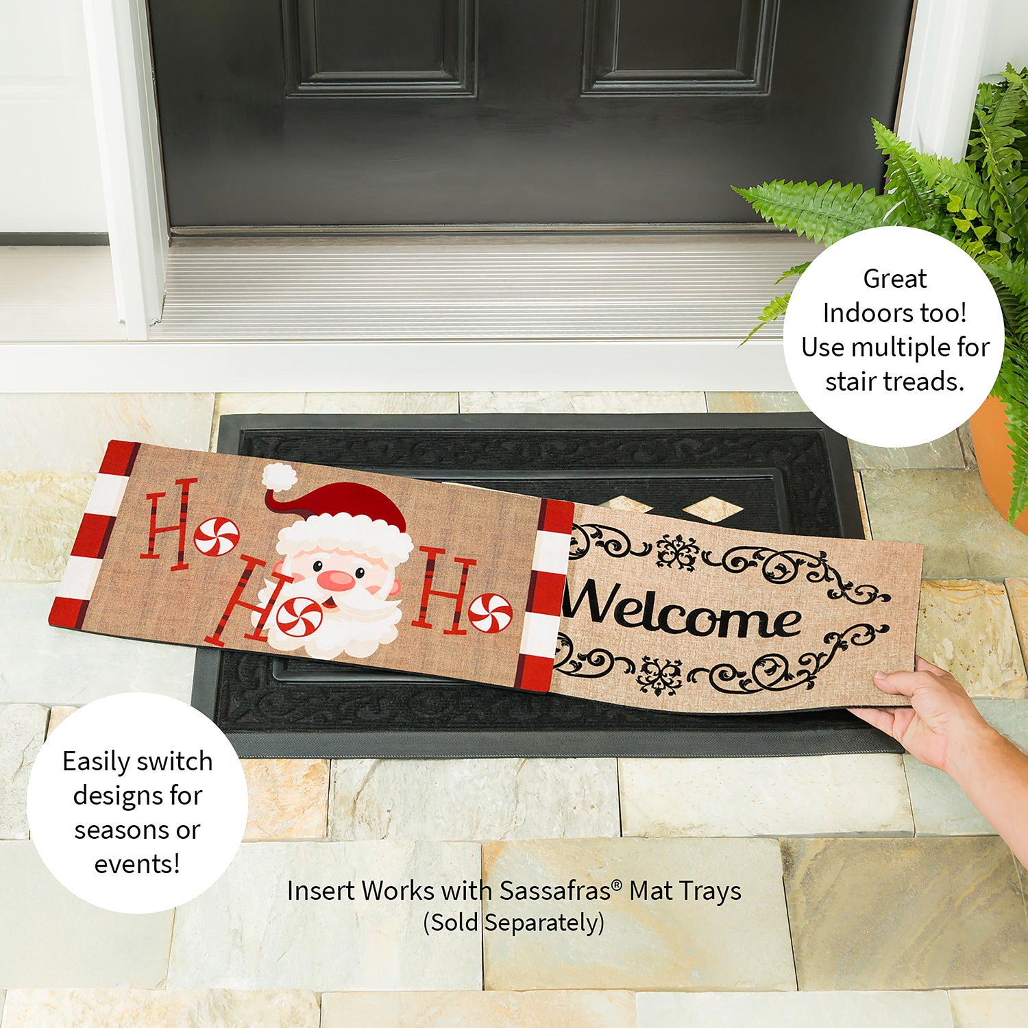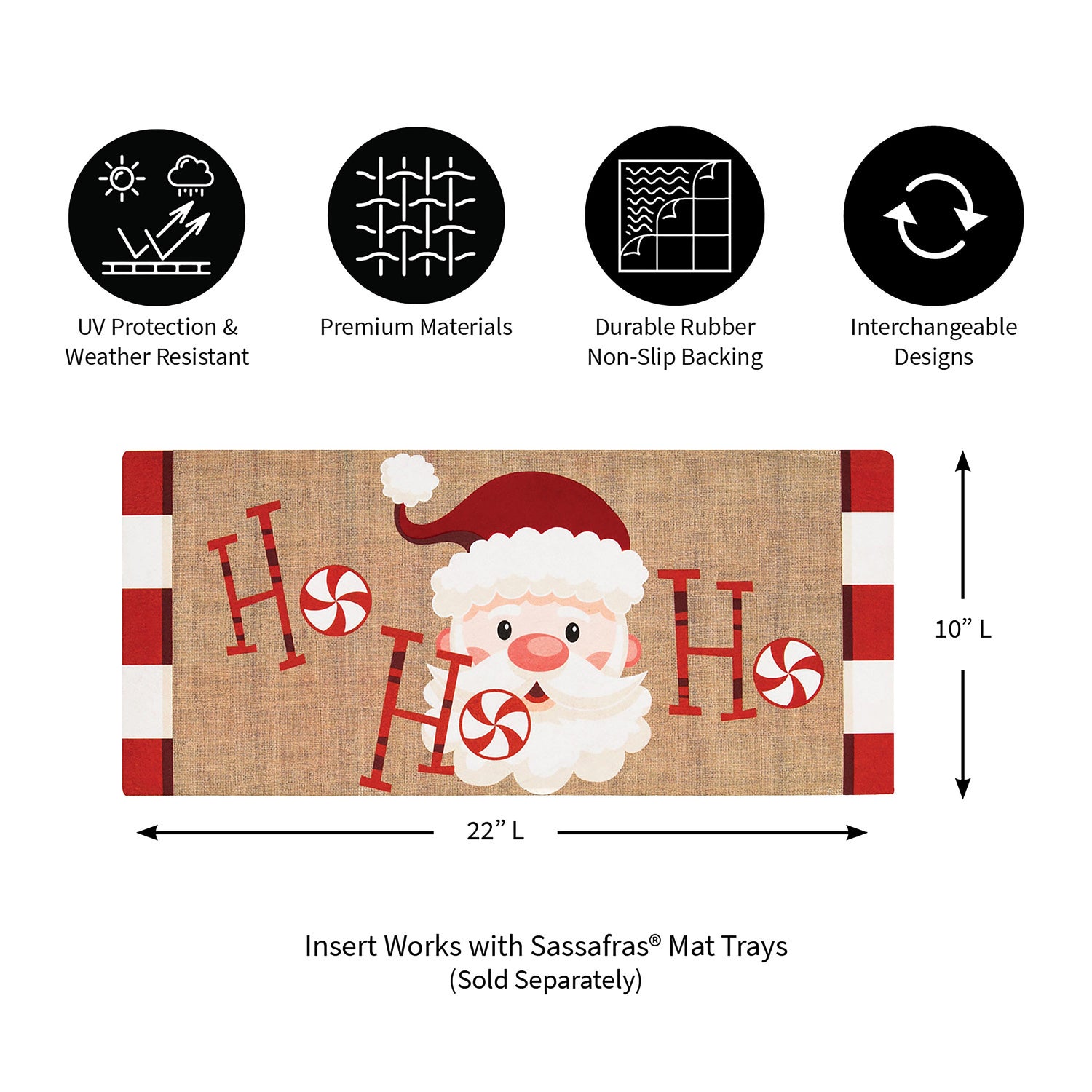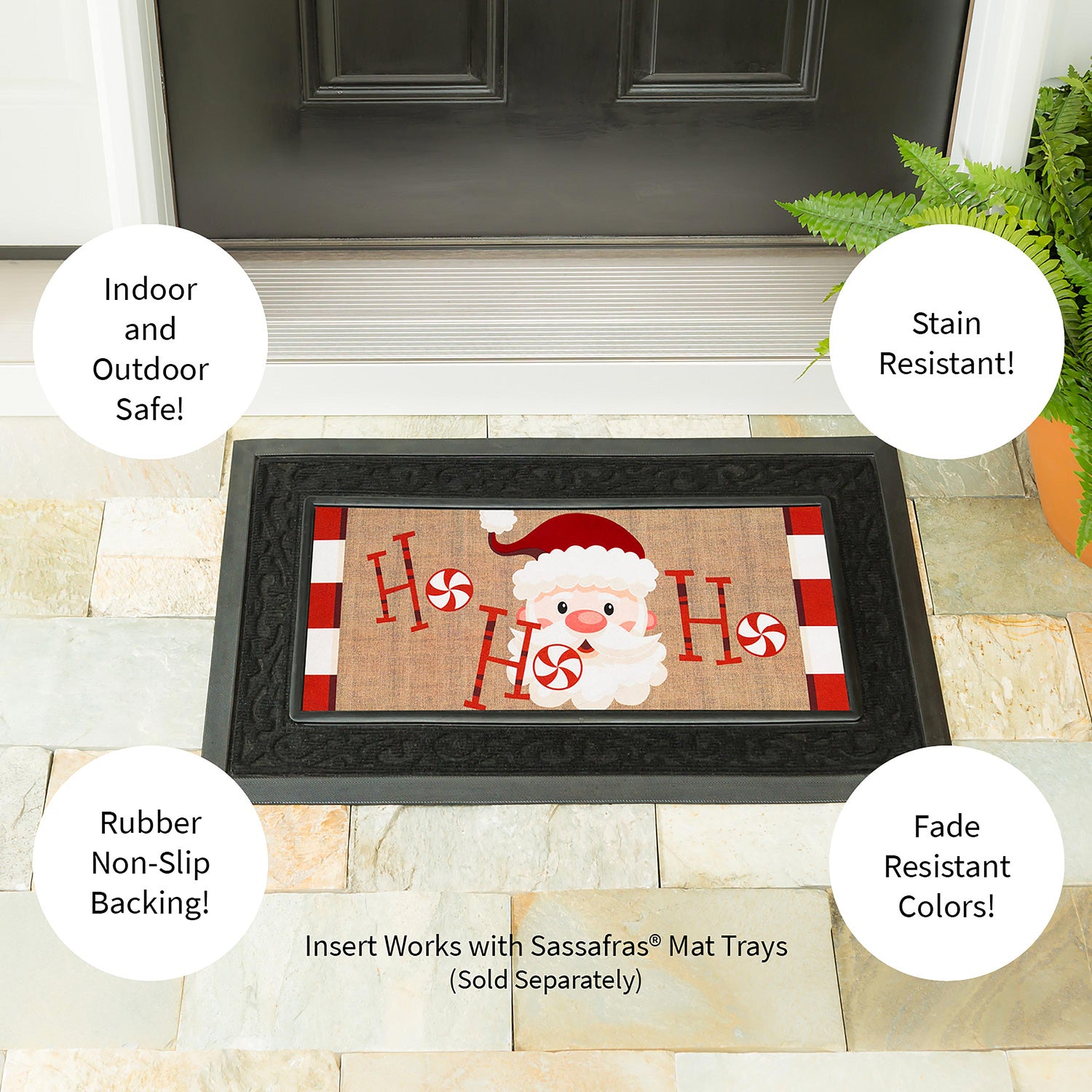 This Christmas-themed Sassafras mat features Santa Claus with his traditional phrase, "Ho, Ho, Ho" along the bottom, replacing the "O"s with peppermint candies. This seasonal, switchable insert is made for placement in Evergreen's Rubber Switch Doormat Frame. The mat is made of rubber and features a heat-sublimated design. The mat is mildew resistant, and features a skid-resistant backing to help keep it in place. This insert measures approximately 10 inches wide and 22 inches long and is safe for indoor or outdoor use. For stains, simply spot clean with soap and warm water.