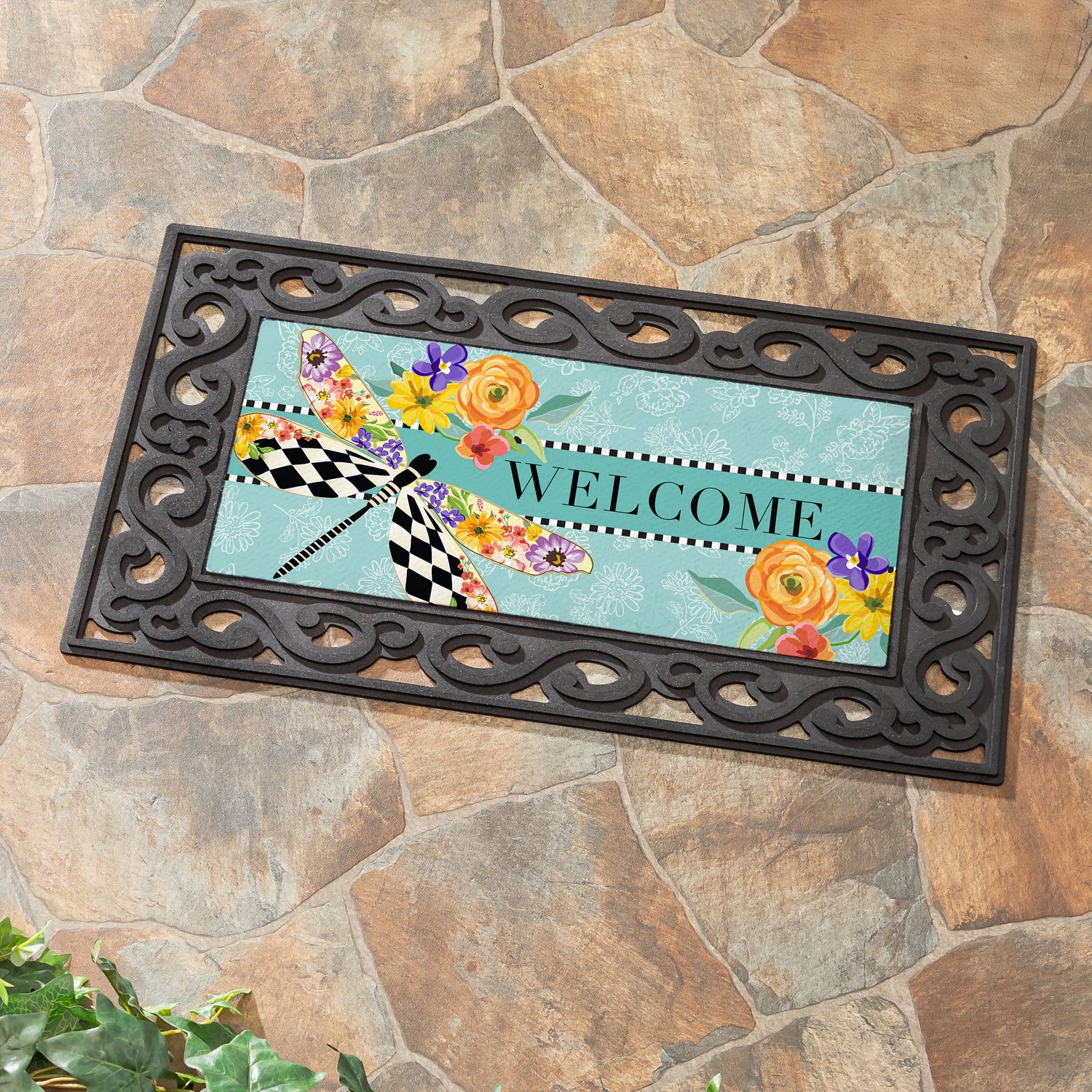 Sweep guests off their feet with our beautifully made Sassafras mats! Made with bright pops of color that are perfect for the season, this mat will put pep in anyone's step. Crafted from heat-sublimated polyester with a rubber backing, this versatile mat is designed to fit perfectly within Evergreen's switch doormat bases. The mildew resistant mat is ideal for indoor or outdoor use and features a skid-resistant backing to help keep it in place. This welcoming mat will freshen up your stoop season after season while ensuring your home stays debris-free. For stains, simply spot clean with soap and warm water.