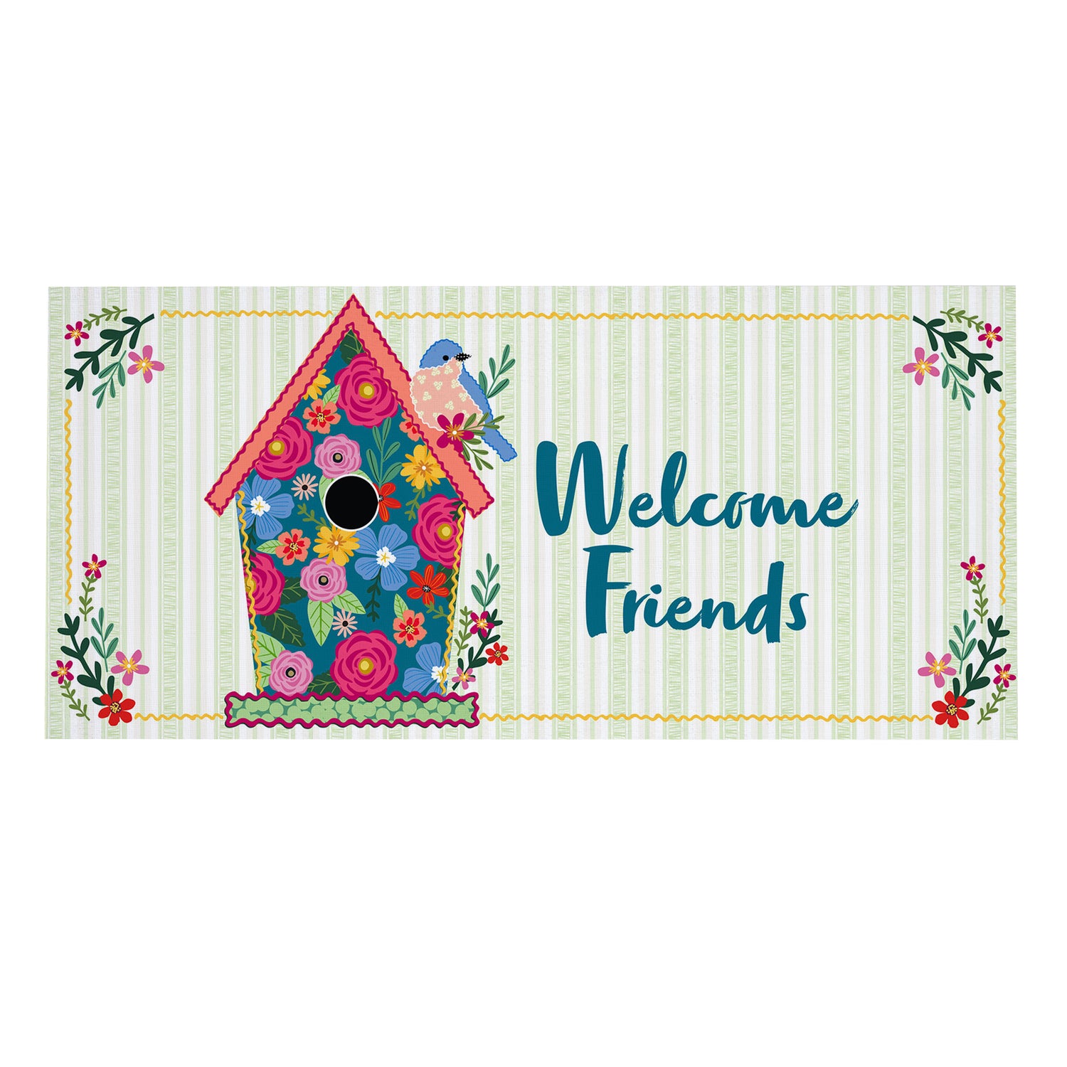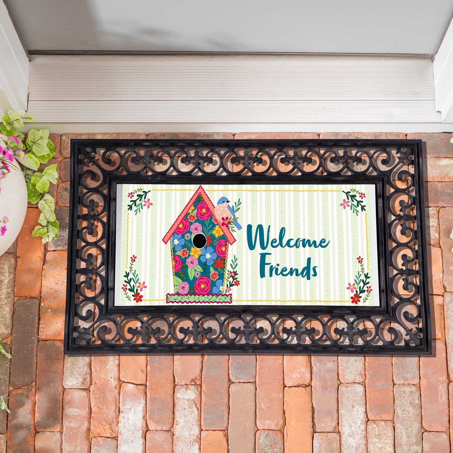Sweep guests off their feet with our beautifully made Sassafras mats! Made with bright pops of color that are perfect for the season, this mat will put pep in anyone's step. Crafted from heat-sublimated polyester with a rubber backing, this versatile mat is designed to fit perfectly within Evergreen's switch doormat bases. The mildew resistant mat is ideal for indoor or outdoor use and features a skid-resistant backing to help keep it in place. This welcoming mat will freshen up your stoop season after season while ensuring your home stays debris-free. For stains, simply spot clean with soap and warm water.
