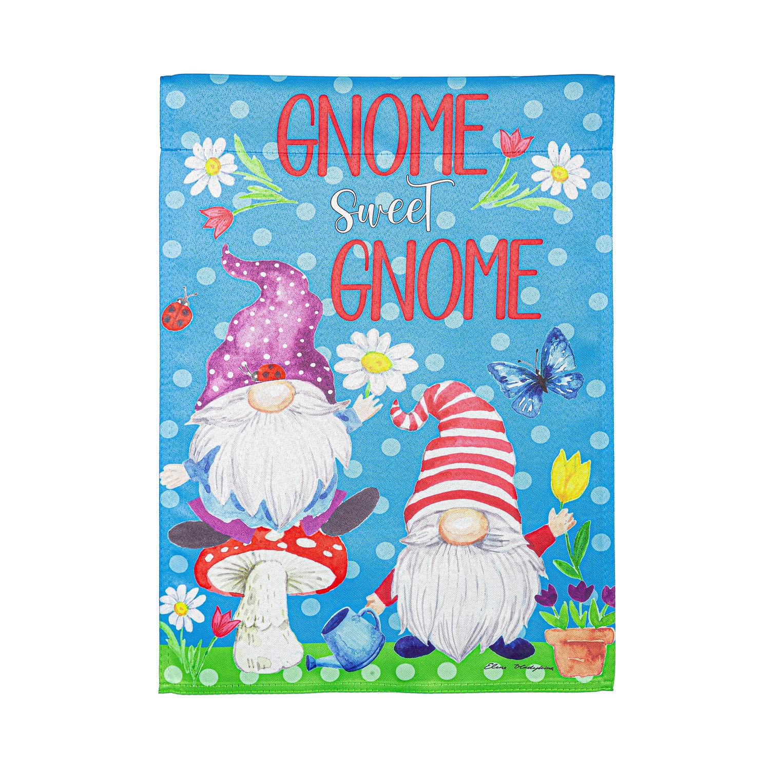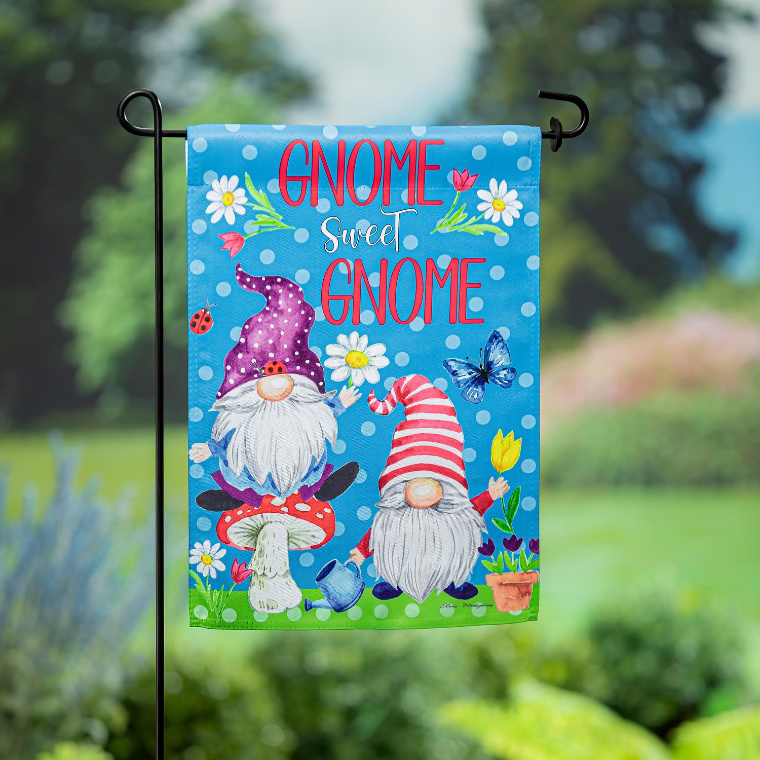 This Gnome Sweet Gnome Suede Garden Flag brings a beautiful statement to any garden. This Suede Reflections flag is made of medium-weight, polyester suede that provides a soft and durable texture. Artwork is heat transferred onto the sun-blocking material so that it is easily viewed from both sides. The weatherproof poly-suede will not fray or fade with continued outdoor use. This flag features a sleeve for use with any standard flagpole or stand, sold separately.