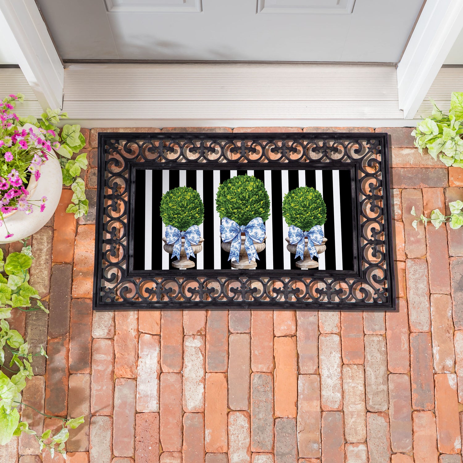 Sweep guests off their feet with our beautifully made Sassafras mats! Made with bright pops of color that are perfect for the season, this mat will put pep in anyone's step. Crafted from heat-sublimated polyester with a rubber backing, this versatile mat is designed to fit perfectly within Evergreen's switch doormat bases. The mildew resistant mat is ideal for indoor or outdoor use and features a skid-resistant backing to help keep it in place. This welcoming mat will freshen up your stoop season after season while ensuring your home stays debris-free. For stains, simply spot clean with soap and warm water.