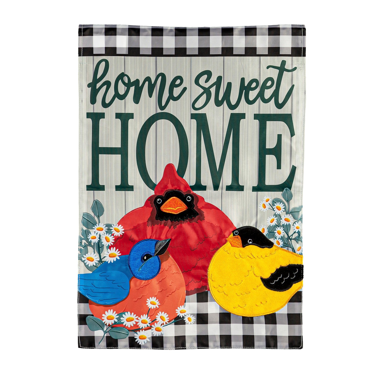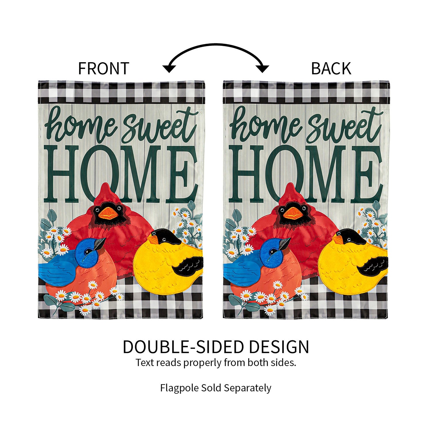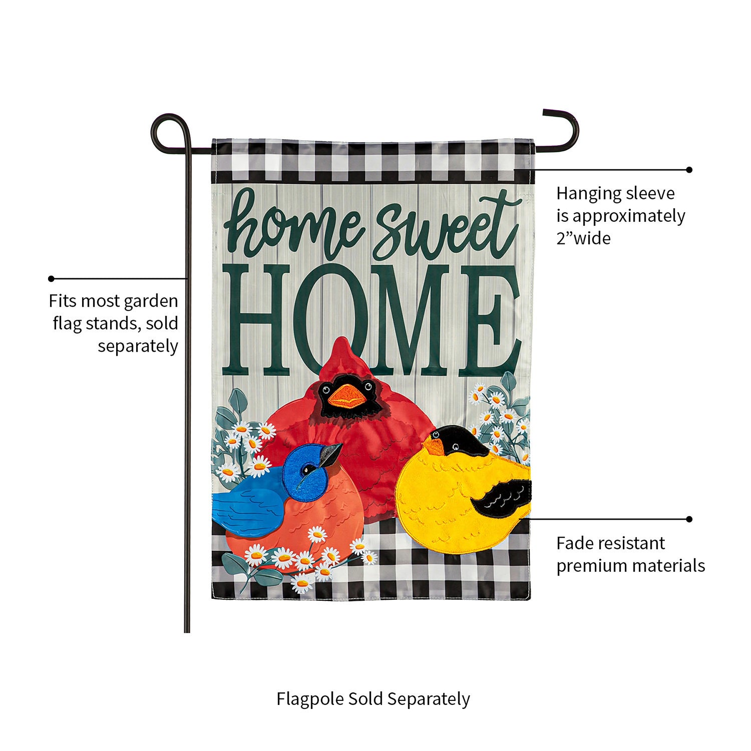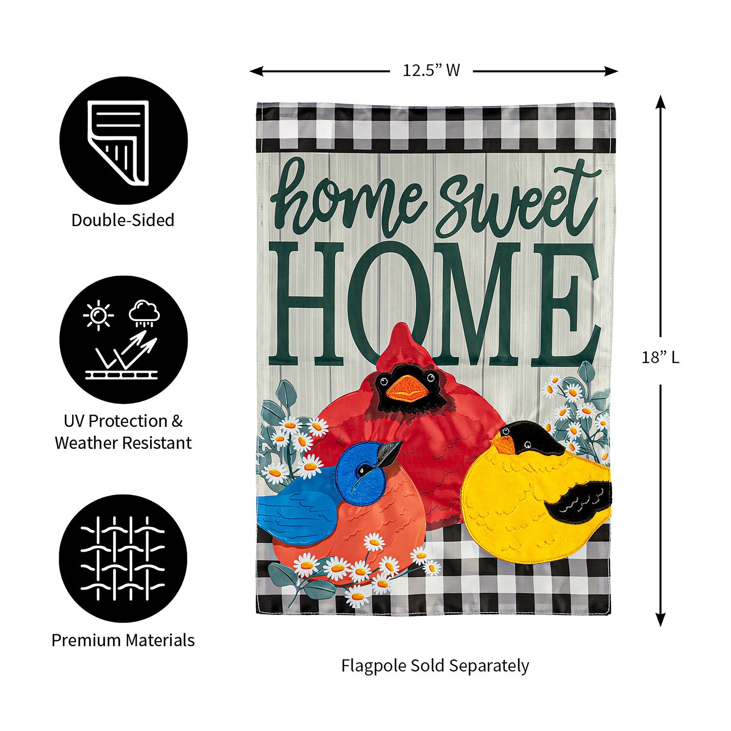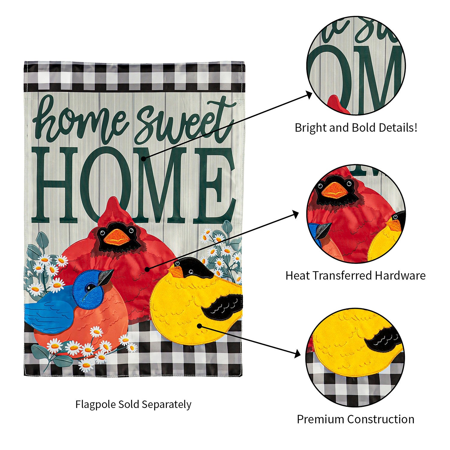 A trio of color, these portly songbirds offer a beautiful sight upon a classic buffalo check backdrop and "Home Sweet Home" message on this garden applique flag. Each Evergreen Flag applique flag is carefully crafted from multiple layers of 310 denier nylon that can withstand a variety of weather conditions. We combine pieces of fade-resistant, strong fabric with tight, detailed stitching to create a dimensional mosaic effect. The soft yet heavyweight material illuminates beautifully in sunlight. Each flag features a sleeve that fits standard flagpoles or stands, sold separately.