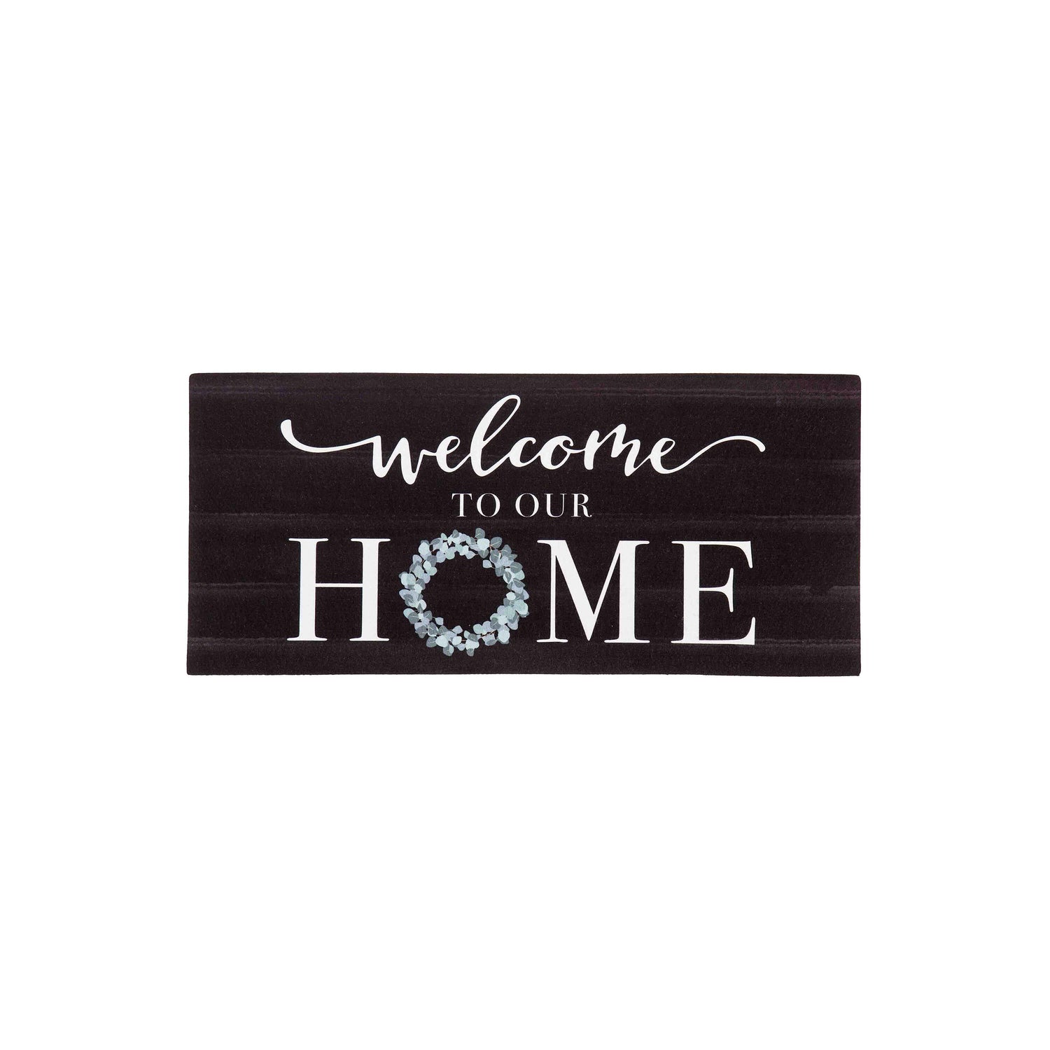 Freshen up your doorstep with this Eucalyptus Welcome Sassafras Switch Mat. Guests will love being greeted by this doormat that reads "Welcome To Our Home" in elegant white letters against a black background. A eucalyptus wreath replaces the O in Home for a refined touch. The durable insert is for placement in a Sassafras mat frame or tray, sold separately. Swap mats seasonally to keep things fresh and fun. The charming design is heat sublimated onto the polyester and rubber insert. Suitable for indoor and outdoor use, the floor mat can also be used on its own as a stair tread or small floor mat. It is mildew resistant and features an anti-slip backing. Spot clean with soap and warm water or hose down. For best results, display your mat in a covered or sheltered area to prevent fading.