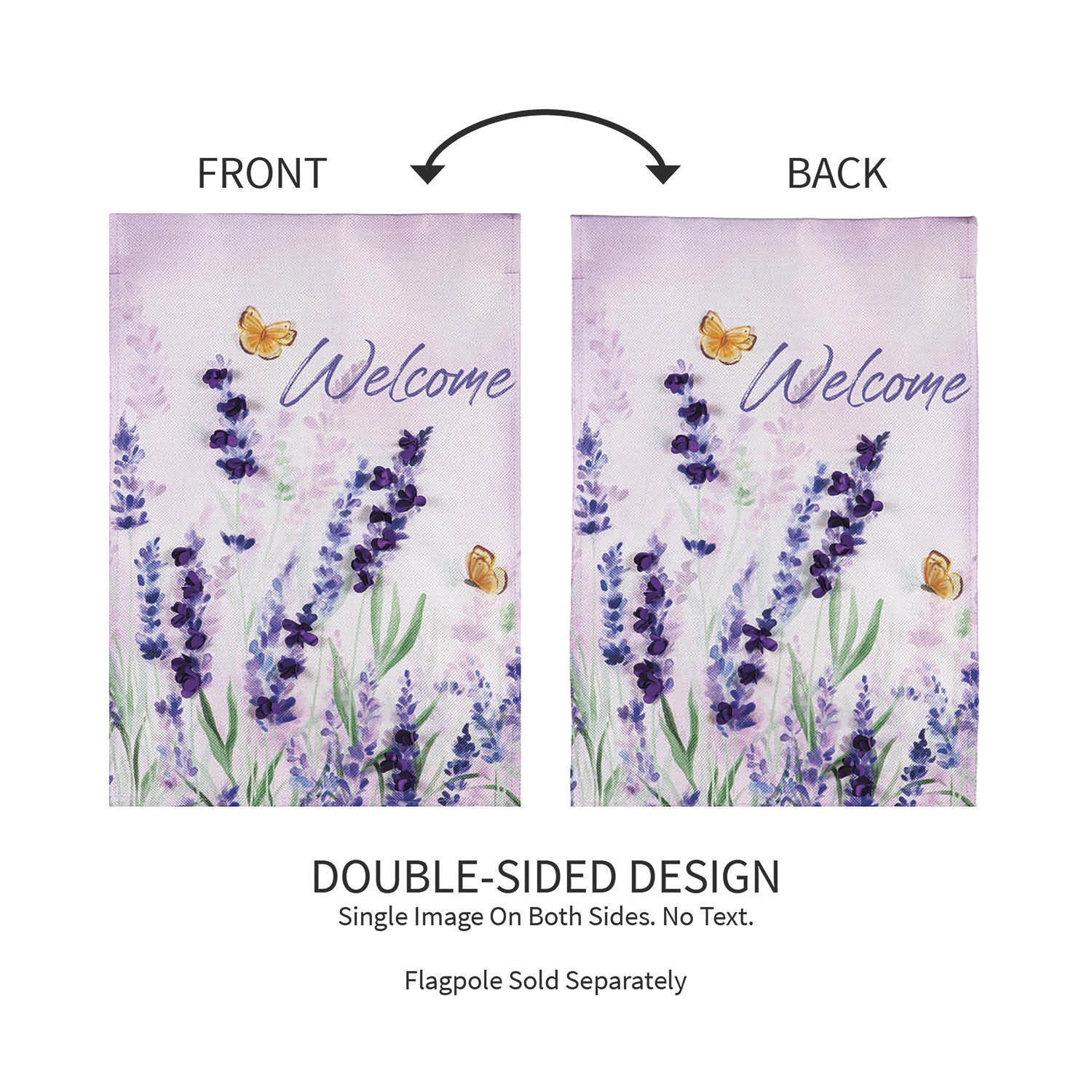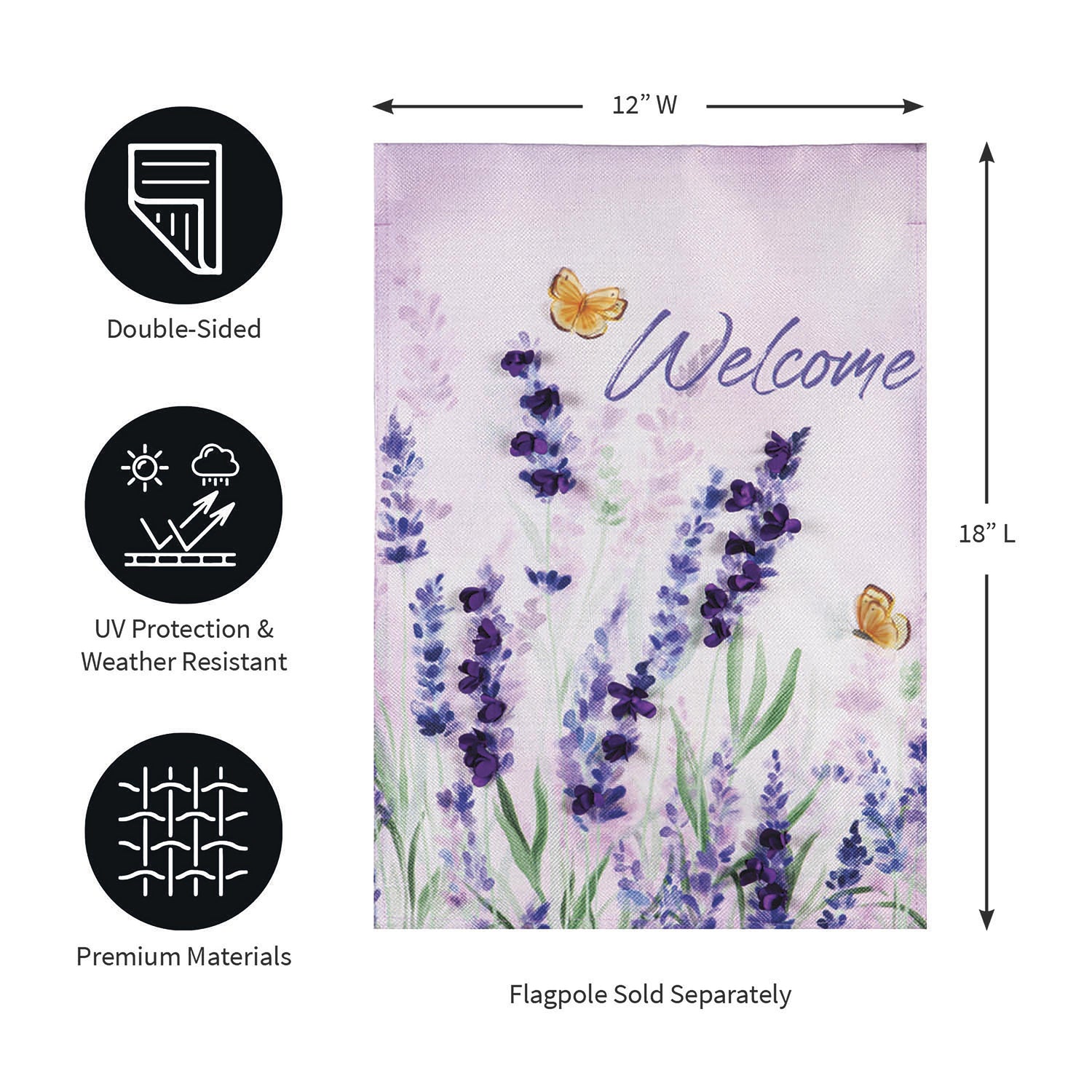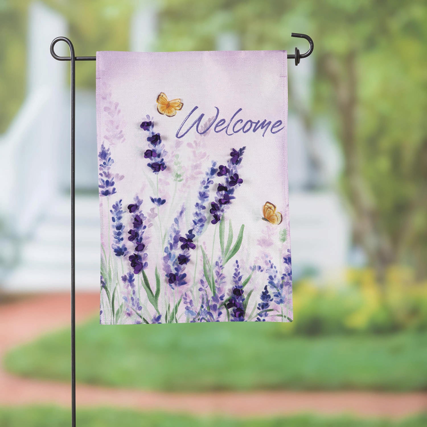 This Hello Spring Lavender Burlap Garden Flag will make a cheerful statement! Crafted of medium-weight, soft polyester burlap fabric, this flag has the look and feel of real burlap. Artwork is heat transferred onto both sides of the textured fabric to create a natural, crafted look. The poly-burlap is a durable and weatherproof material that will not fade or fray after continued use. All flags also feature a sleeve for use with any standard flagpole or stand, sold separately.
