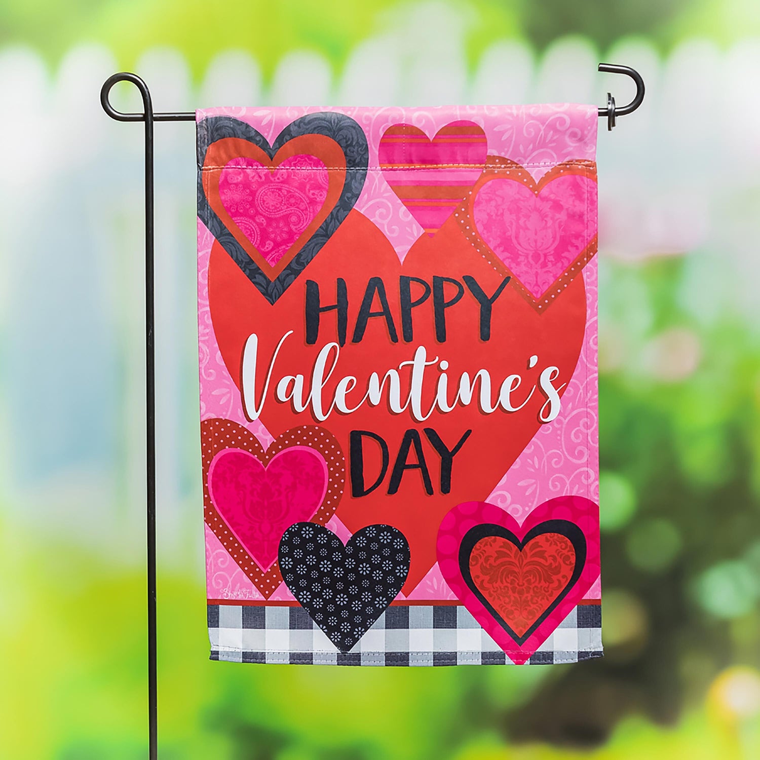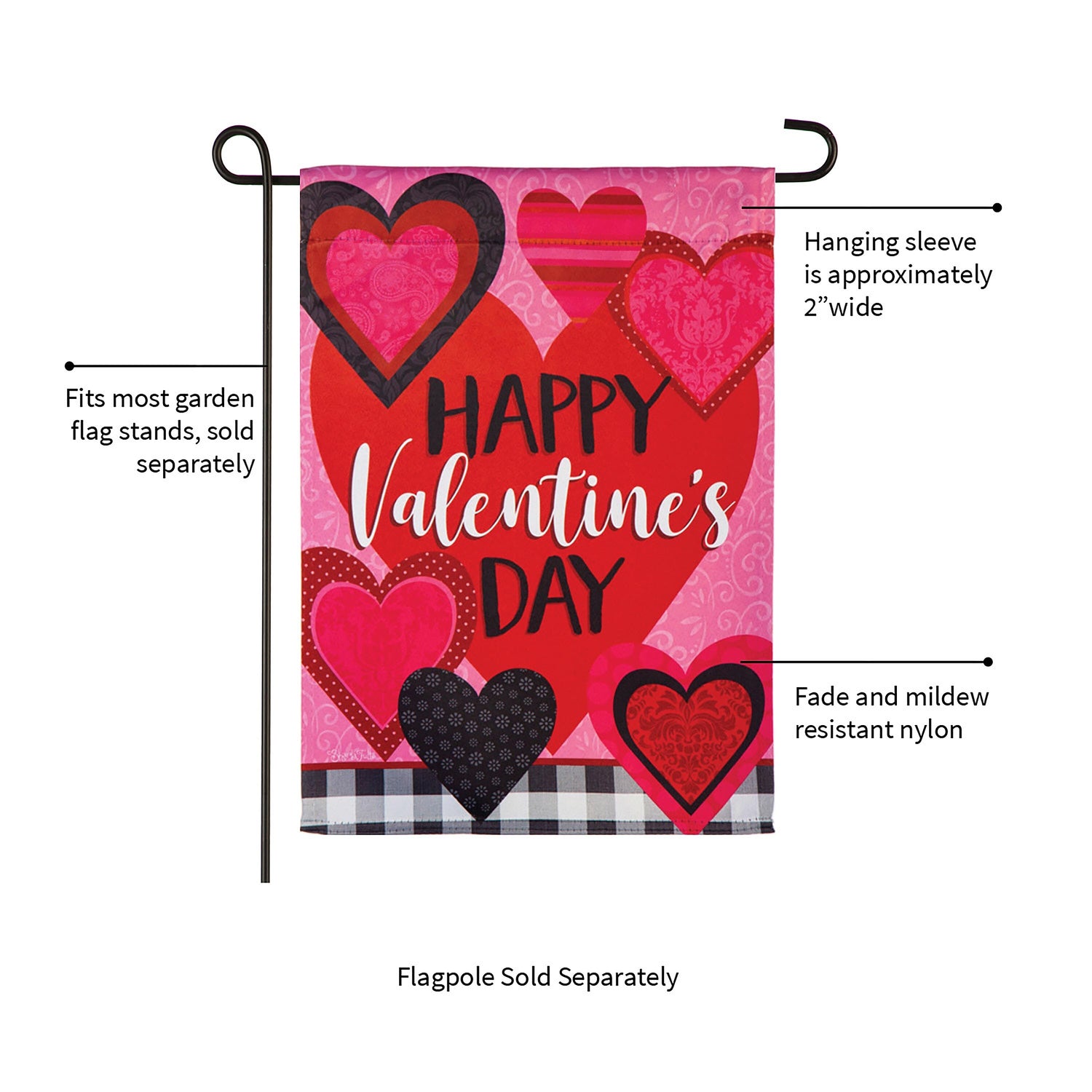 Share a message of vibrance and love this Valentine's Day with our Patterned Valentine Hearts Garden Suede Flag. Colorfully patterned hearts make a sentimental statement above a black and white buffalo check border in a delightful design that greets passersby with a "Happy Valentine's Day" message. The eye-catching artwork is carefully heat transferred onto sun-blocking material, resulting in a beautiful, high-quality finished product. Each Suede Reflections flag is made of weatherproof polyester suede that is soft yet durable. Our attention to detail and level of craftsmanship ensure that the flag won't fade or fray, even with continued outdoor use.