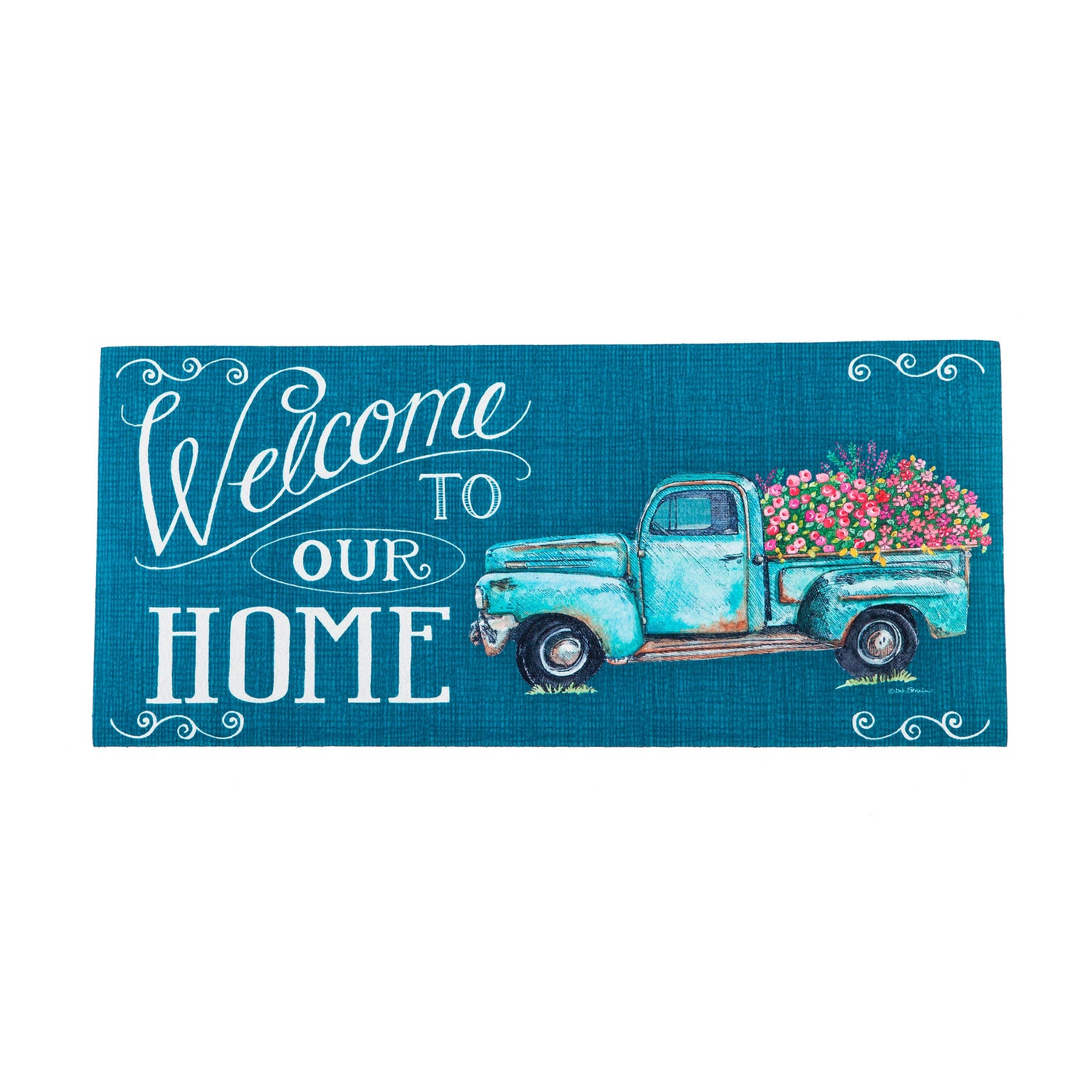 Greet guests in style with this Welcome to our Home floral truck switch mat. The durable insert is created for placement in a Sassafras® mat frame or tray, sold separately. Swap mats seasonally to keep things fresh and fun. This adorable design is heat sublimated onto the polyester and rubber insert. Suitable for indoor and outdoor use, the mat can also be used on its own as a stair tread or small floor mat. It is mildew resistant and features an anti-slip backing. Spot clean with soap and warm water or hose down. For best results, display your mat in a covered or sheltered area to prevent fading.