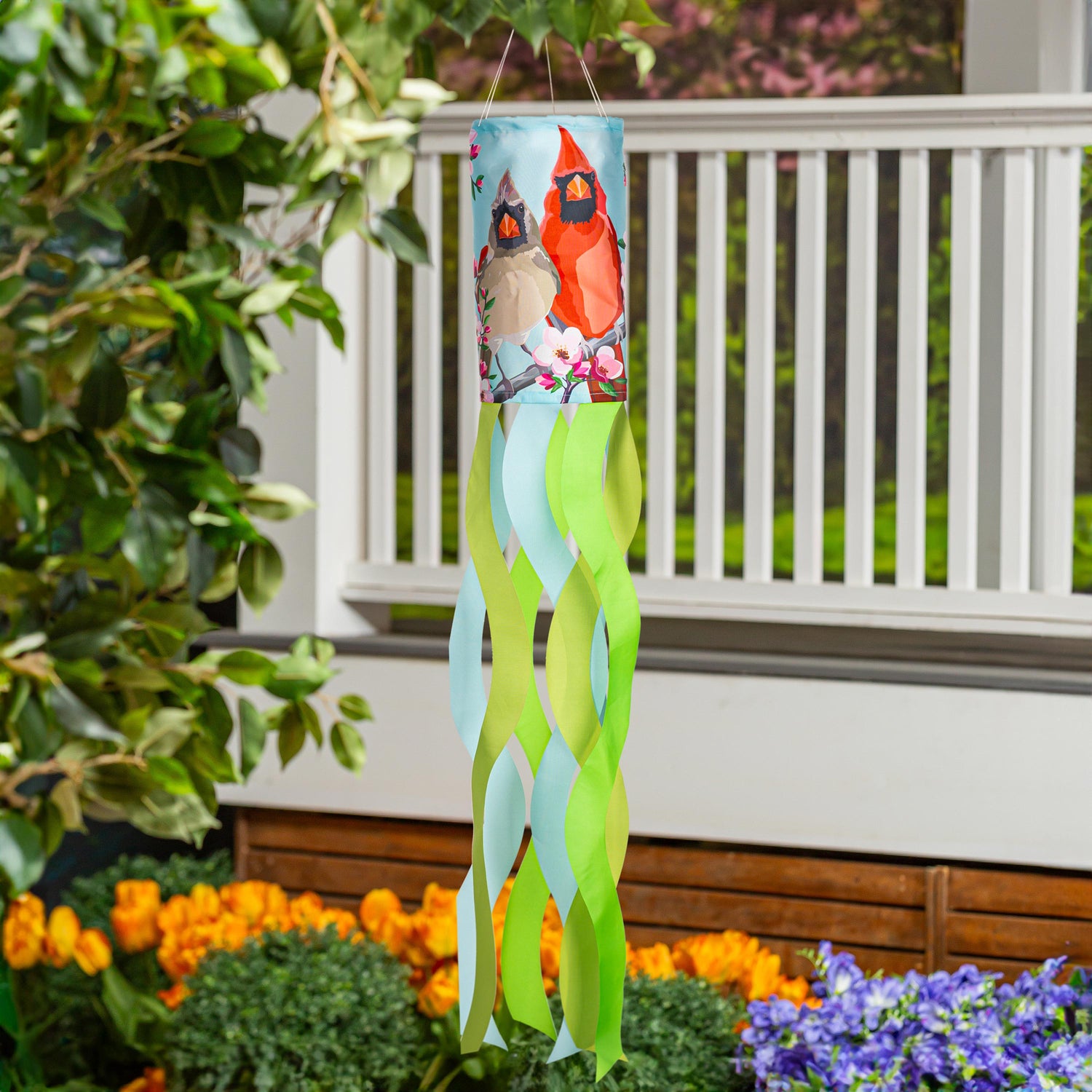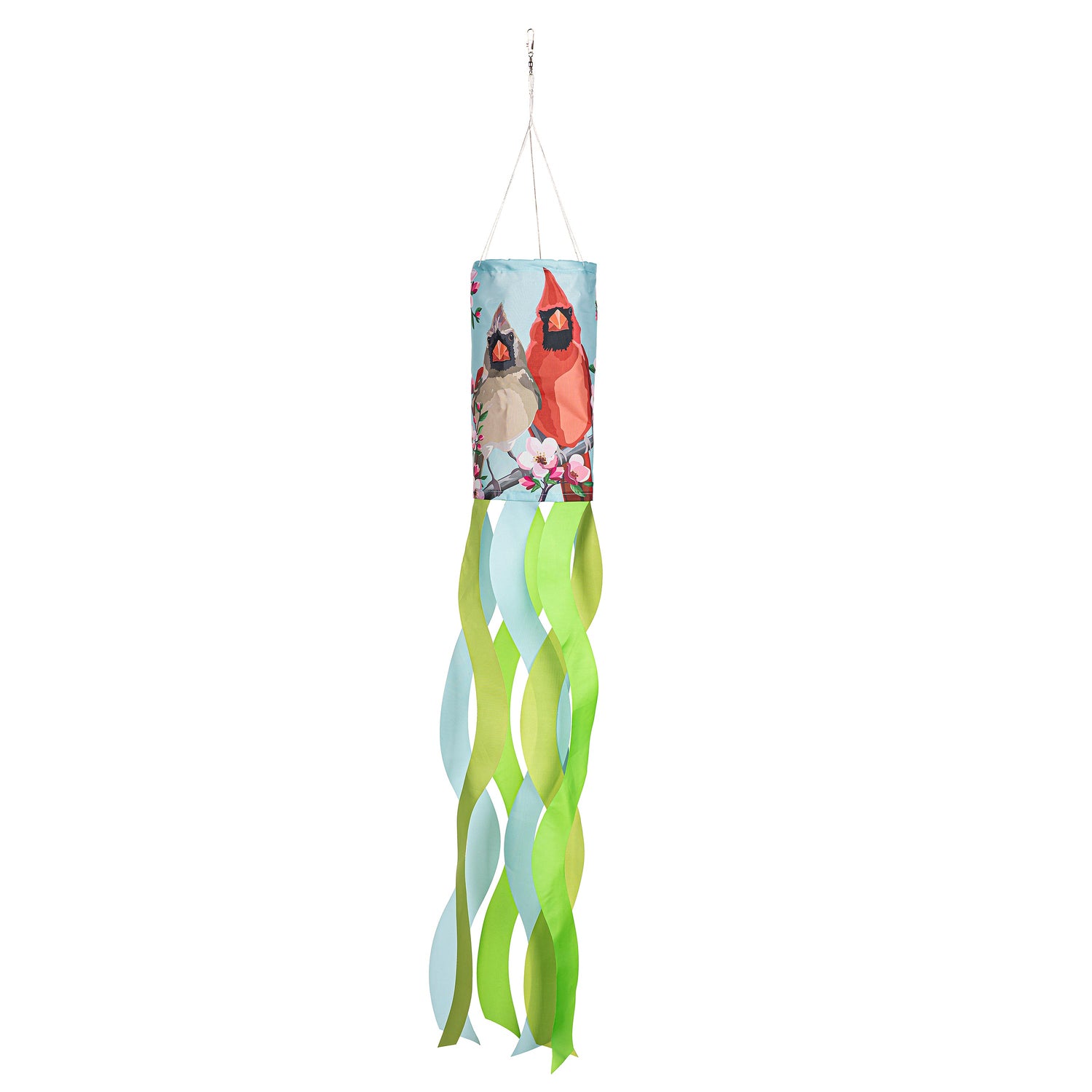 This elegant nature-inspired design will add movement and whimsy to any garden. Perfect for springtime, this windsock features a beautiful cardinal couple perched on a cherry blossom branch. Colorful tails with hemmed edges dance in the wind, bringing the design to life every time the wind blows. The artwork is heat sublimated onto weather-resistant nylon fabric with superior quality. A poly-carbonate plastic hoop at the top opening holds the shape of the windsock. Its attached bridle string and swivel snap make hanging easy.