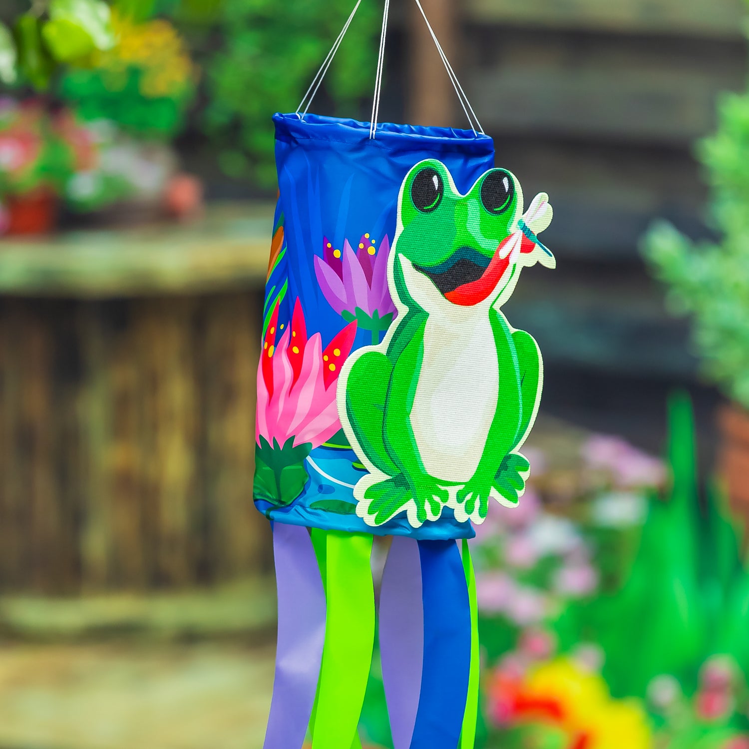 The darling design of this windsock will add movement and whimsy to any garden. Colorful tails with hemmed edges dance in the wind, bringing the design to life every time the wind blows. Perfect for summer, it's made with durable materials to ensure it lasts year after year. The artwork is heat sublimated onto weather-resistant nylon fabric with superior quality. A poly-carbonate plastic hoop at the top opening holds the shape of the windsock and its attached bridle string and swivel snap make hanging easy.