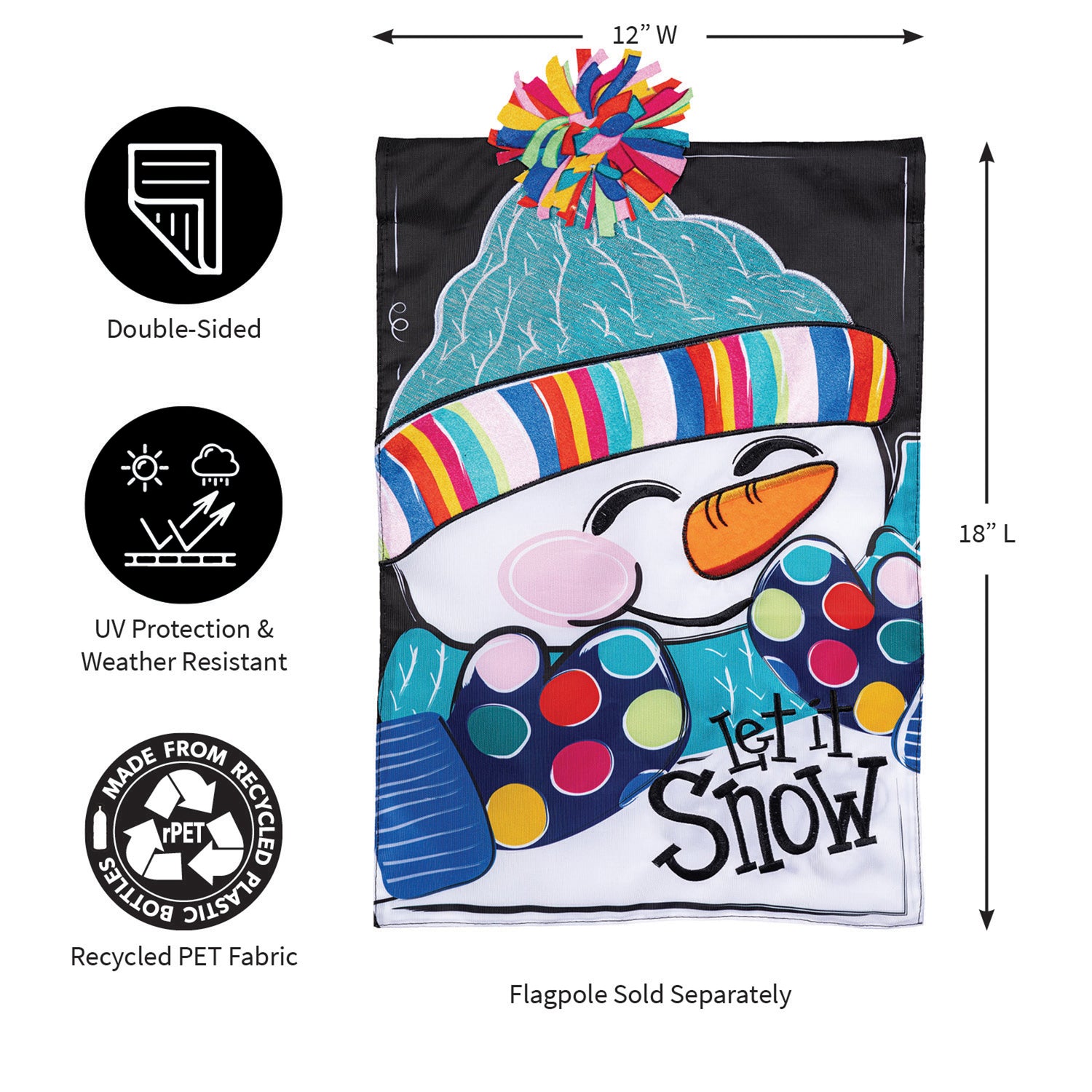 Add magic and wonder to any garden or yard when you hang up this beautiful flag. Featuring an adorable snowman wearing a hat and gloves, this flag is perfect for the festive season. Each Evergreen applique flag is carefully crafted from multiple layers of 310 denier nylon made from recycled plastic that can withstand a variety of weather conditions. We combine pieces of fade-resistant, strong fabric with tight, detailed stitching to create a dimensional mosaic effect. The soft yet heavyweight material illuminates beautifully in sunlight. Each flag features a sleeve that fits standard flagpoles or stands, sold separately. Due to the nature of the packaging, wrinkling may have occurred. Once item is unfolded and mounted on hardware, the creases will naturally fall out. Spot clean only. Never put in a dryer. When not in use, flags can be hung in a closet or placed in a storage container.
