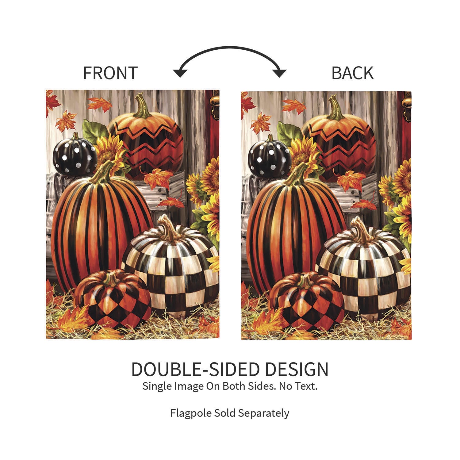 Welcome friends and family to the home with this burlap garden flag. It features a realistic design of patterned pumpkins sitting on the ground surrounded by sunflowers and leaves. Crafted of medium-weight materials, this flag has the look and feel of real burlap. Artwork is heats transferred onto both sides of the textured fabric to create a natural, crafted look. The poly-burlap is a durable and weatherproof material that will not fade or fray after continued use. All flags also feature a sleeve for use with any standard flagpole or stand, sold separately.