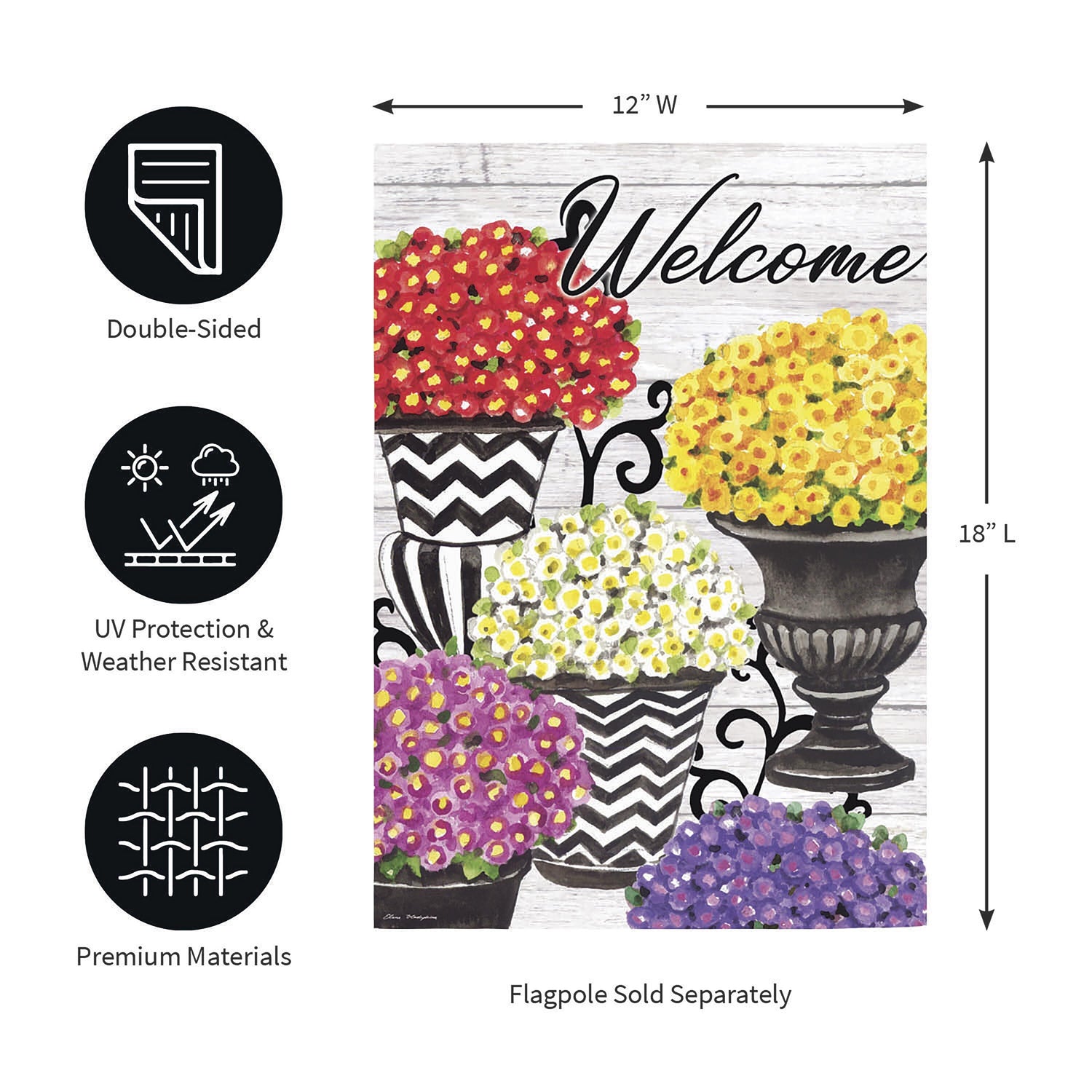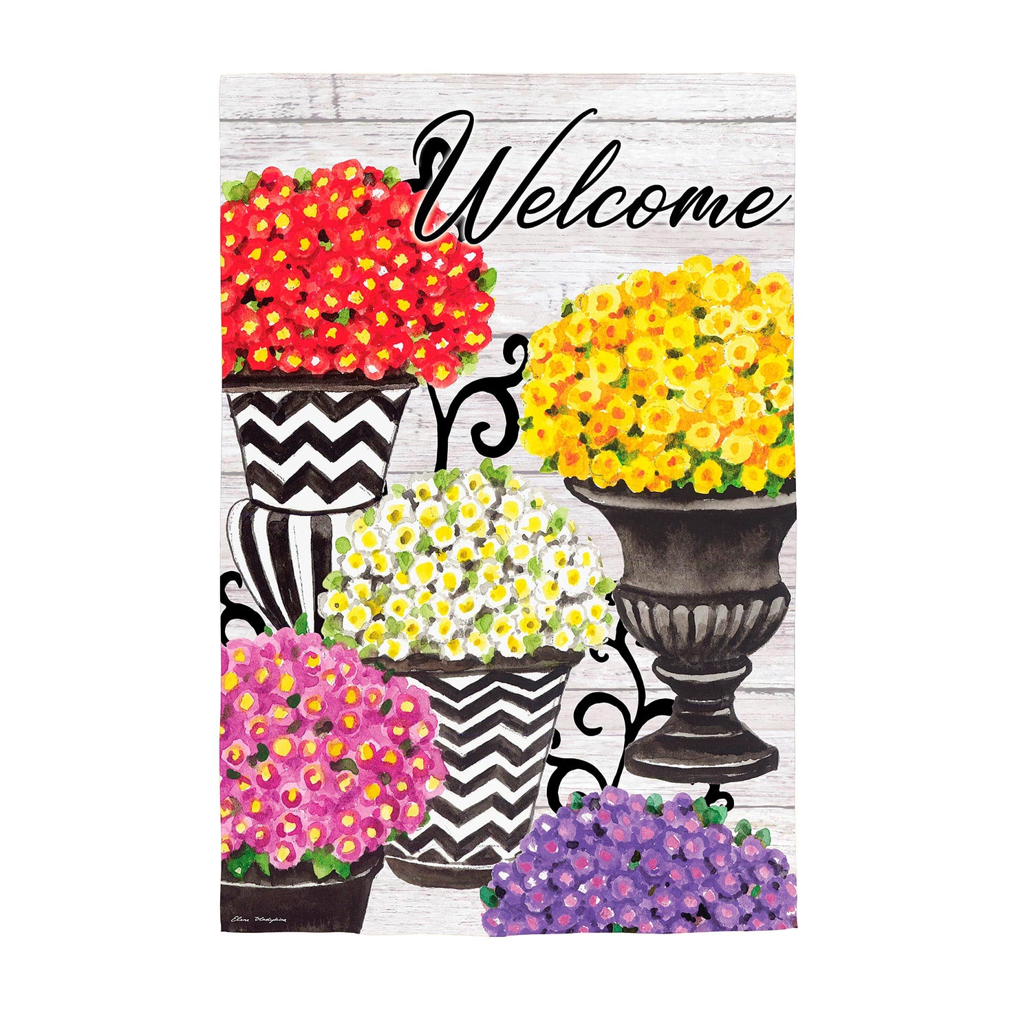 Welcome friends and family to the home with this suede garden flag. This flag features beautiful topiaries with brightly colored flowers in red, yellow, and pink. The eye-catching artwork is carefully heat transferred onto sun-blocking material, resulting in beautiful, high-quality finished product. Each Suede Reflection flag is made of weatherproof material that is soft yet durable. Our attention to detail and level craftsmanship ensure that the flag won’t fade or fray, even with continued outdoor use.