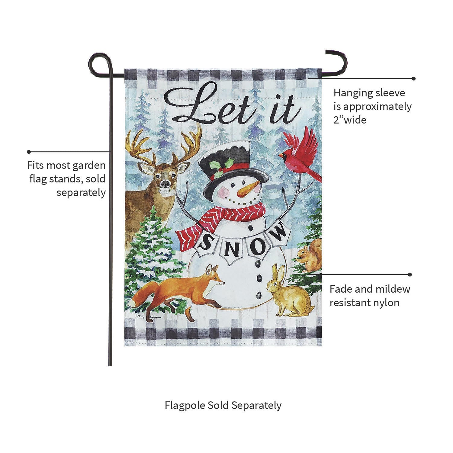 Decorate for the season and welcome friends and family to the home with this suede garden flag. It features a friendly snowman bundled up in a hat and scarf with all his woodland friends surrounding him. The “Let it snow” message is perfect for anyone who loves the chilly time of year. Artwork is heat transferred onto the sun-blocking material so that it is easily viewed from both sides. The weatherproof poly-suede will not fray or fade with continued outdoor use. This flag features a sleeve for use with any standard flagpole or stand, sold separately.