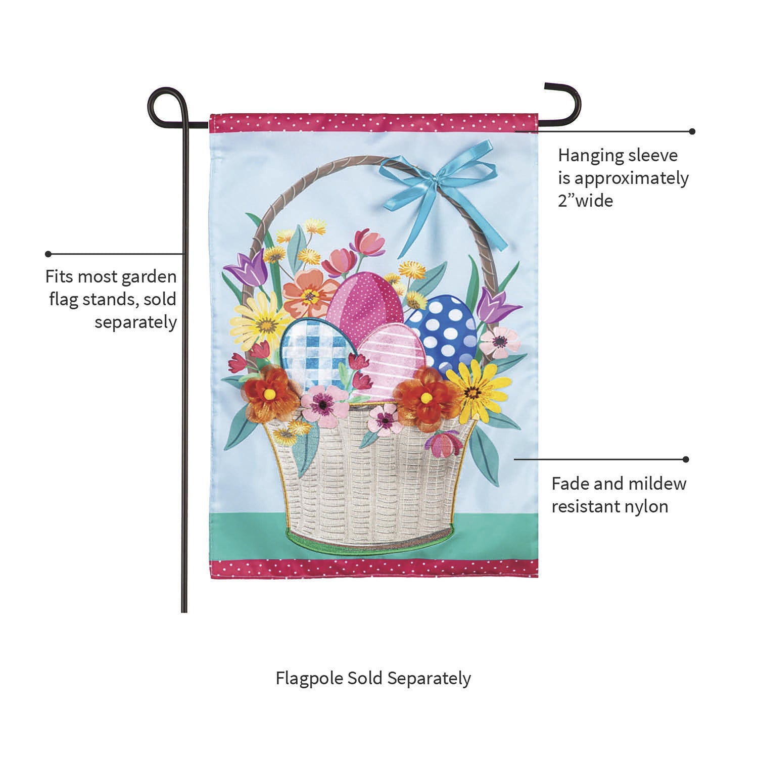 Celebrate the season with this Garden Flag featuring colorful, overflowing Easter basket. Each Evergreen applique flag is carefully crafted from multiple layers of 310 denier nylon that can withstand a variety of weather conditions. We combine pieces of fade-resistant, strong fabric with tight, detailed stitching to create a dimensional mosaic effect. The soft yet heavyweight material illuminates beautifully in sunlight. Each flag features a sleeve that fits standard flagpoles or stands, sold separately. Due to the nature of the packaging, wrinkling may have occurred. Once item is unfolded and mounted on hardware, the creases will naturally fall out. Spot clean only. Never put in a dryer. When not in use, flags can be hung in a closet or placed in a storage container.