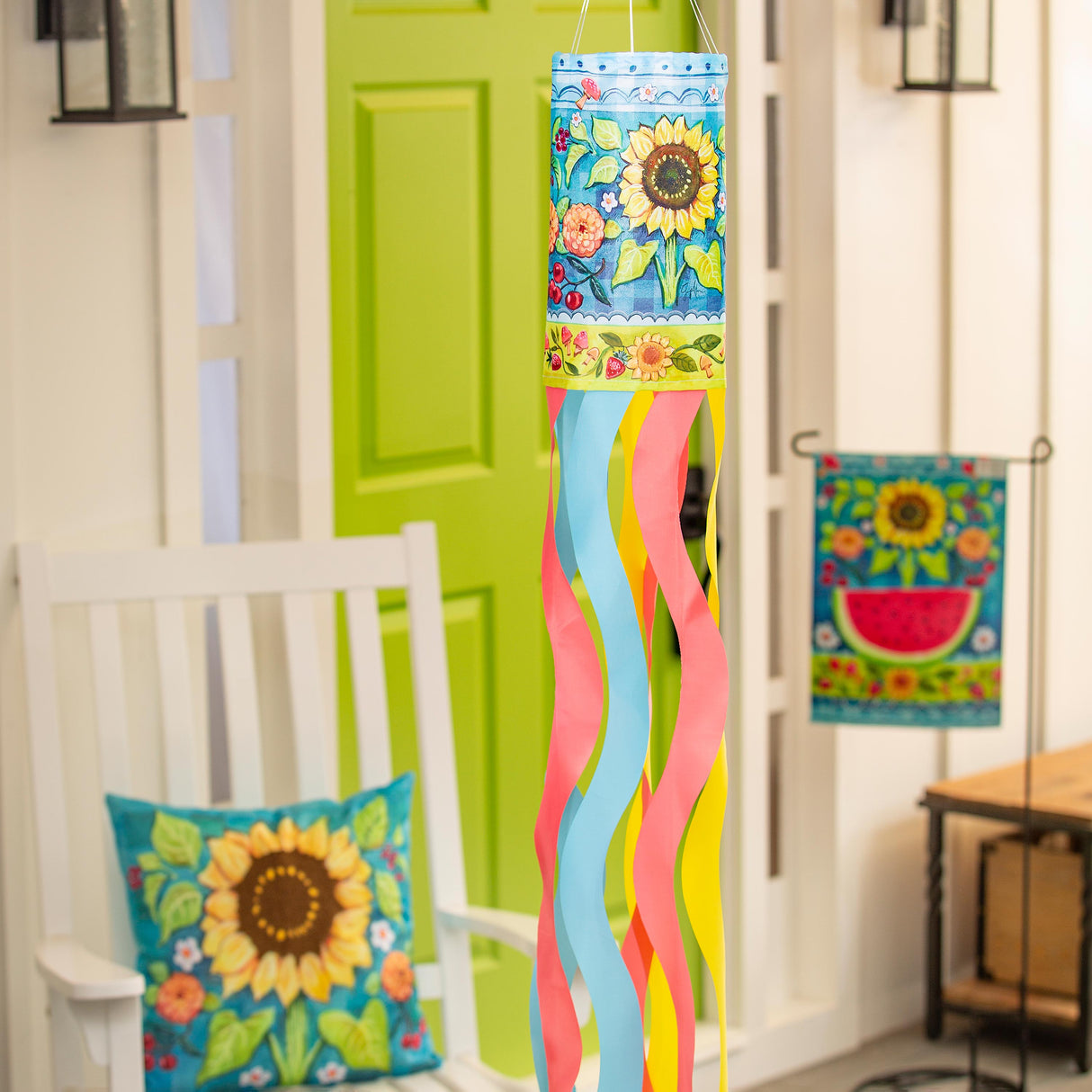 This elegant nature-inspired design will add movement and whimsy to any garden. Colorful tails with hemmed edges dance in the wind, bringing the design to life every time the wind blows. The artwork is heat sublimated onto weather-resistant nylon fabric with superior quality. A poly-carbonate plastic hoop at the top opening holds the shape of the windsock. Its attached bridle string and swivel snap make hanging easy.