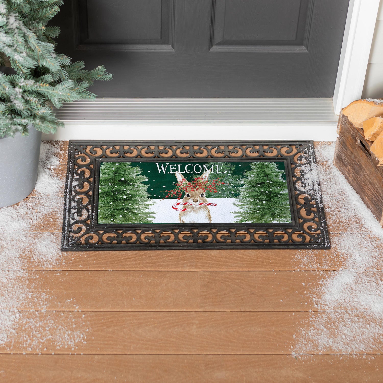 Step into winter style with this Sassafras switch mat. Perfect for adding an extra charming touch to any entryway, this welcoming design features an adorable bunny with a candy cane. Crafted from heat-sublimated polyester with a rubber backing, this versatile mat is designed to fit perfectly within Evergreen's switch doormat bases. The mildew resistant mat is ideal for indoor or outdoor use and features a skid-resistant backing to help keep it in place. This welcoming mat will freshen up your stoop season after season while ensuring your home stays debris-free. For stains, simply spot clean with soap and warm water.