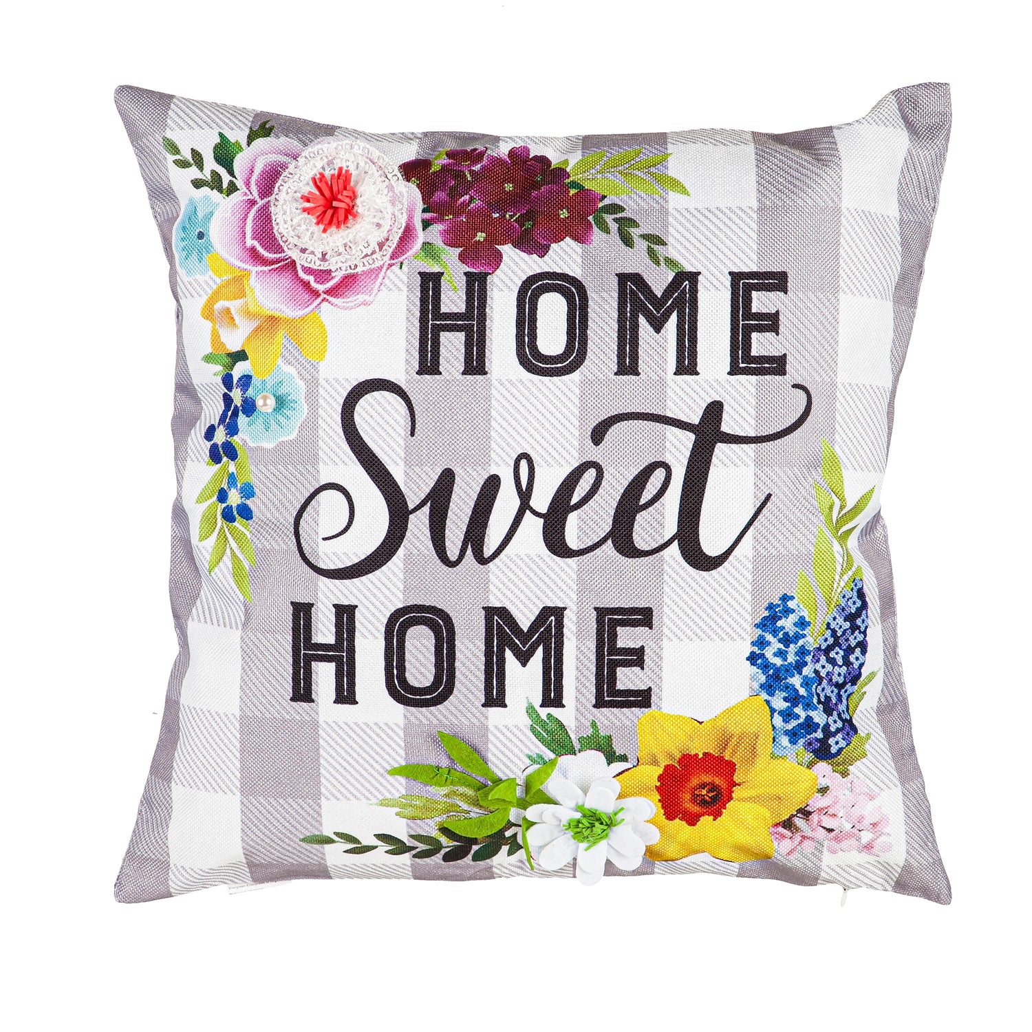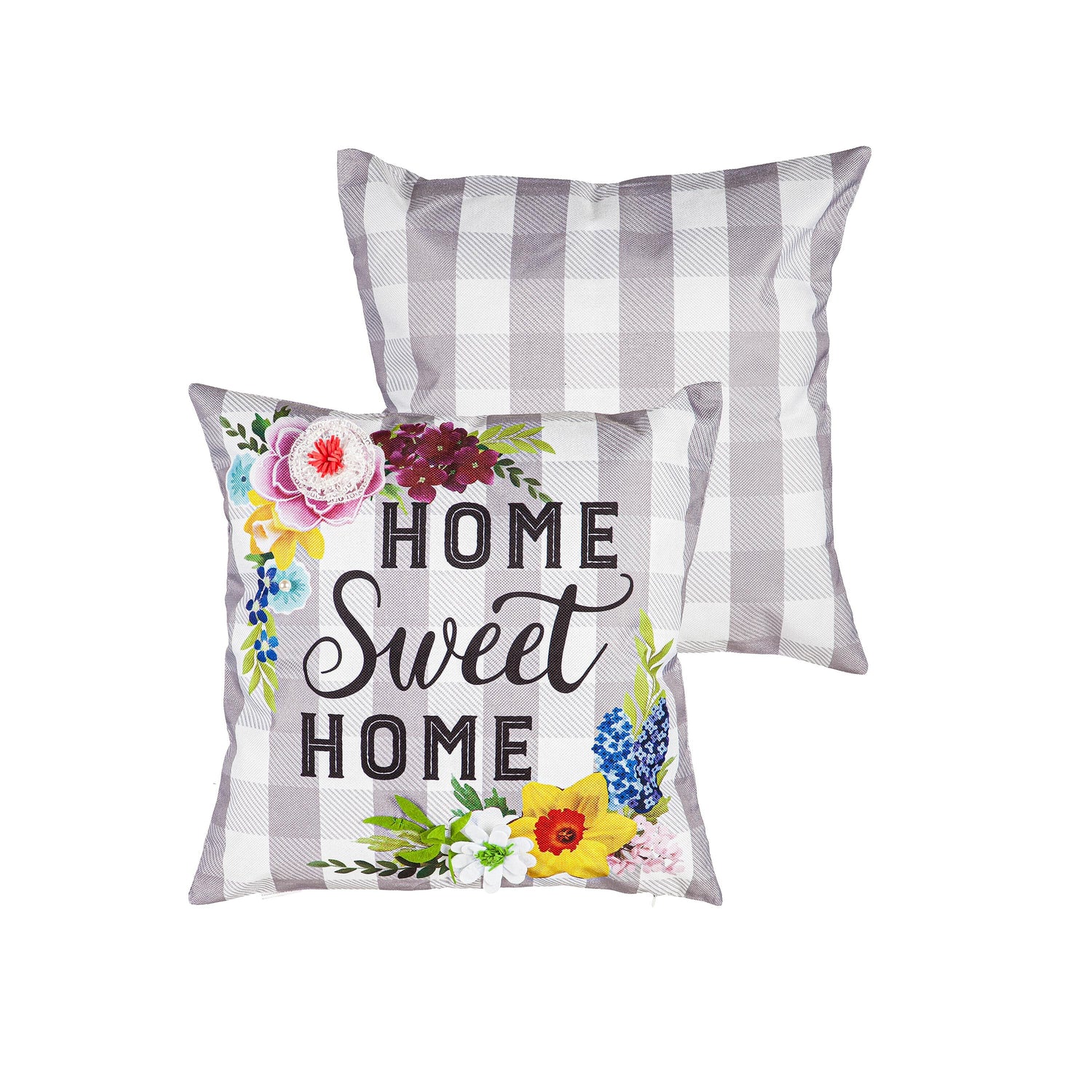 Featuring bold florals and plaid background, this Home Sweet Home sentiment makes a friendly statement in any home. The pillow case is crafted from a polyblend that offers a comfortable texture and has a complementing patterned back. Spot clean only.